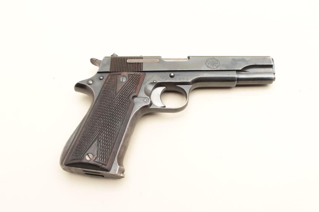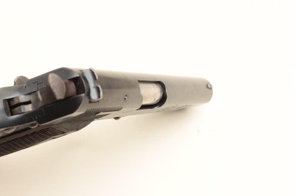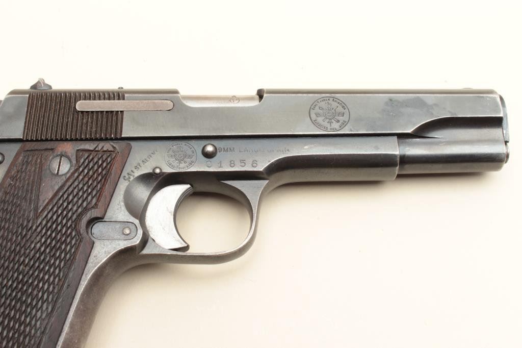finish, checkered wood grips, S/N 283931, in overall good to very good condition displaying the majority of its blued finish, several additional markings on the right side of frame and slide suggesting possible foreign Air Force use; good bore, crisp action, sharp markings and overall good grips. (C&R/PPT): Est.: $350-$700.