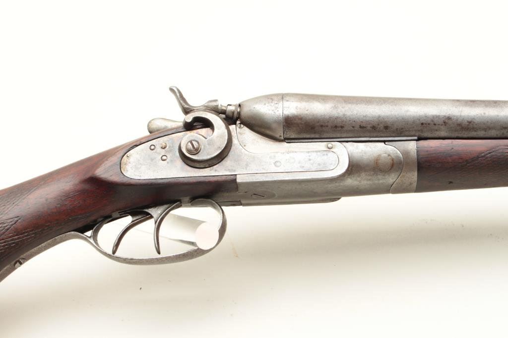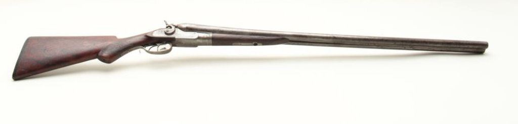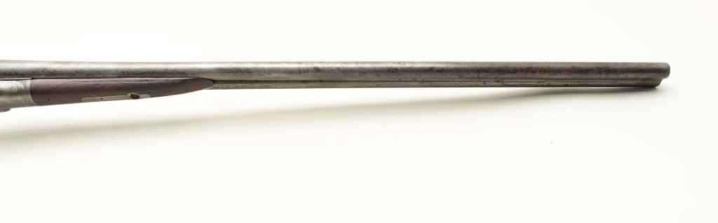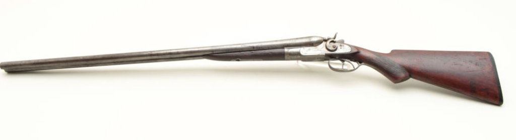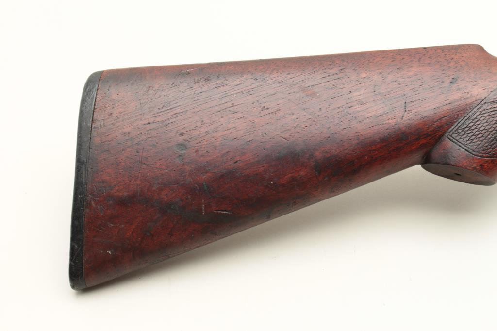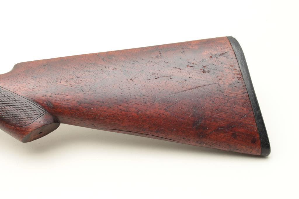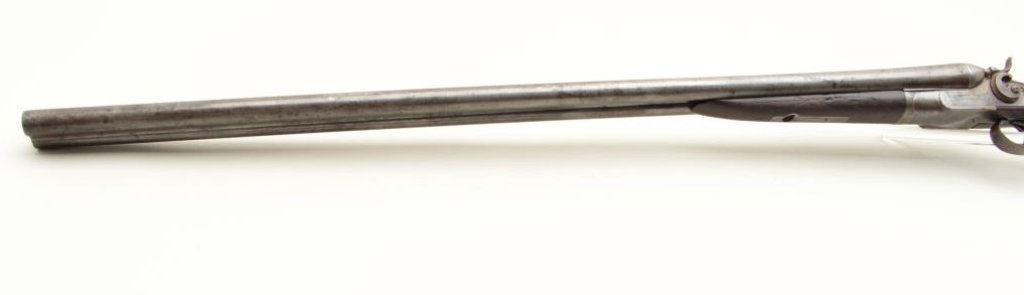 32” barrels, double trigger, 13 ¾” LOP, 48 3/8” overall. Shotgun is in good condition, overall, good bores, good action, missing the small cap for the pistol grip. (Antique) Est. $125-250