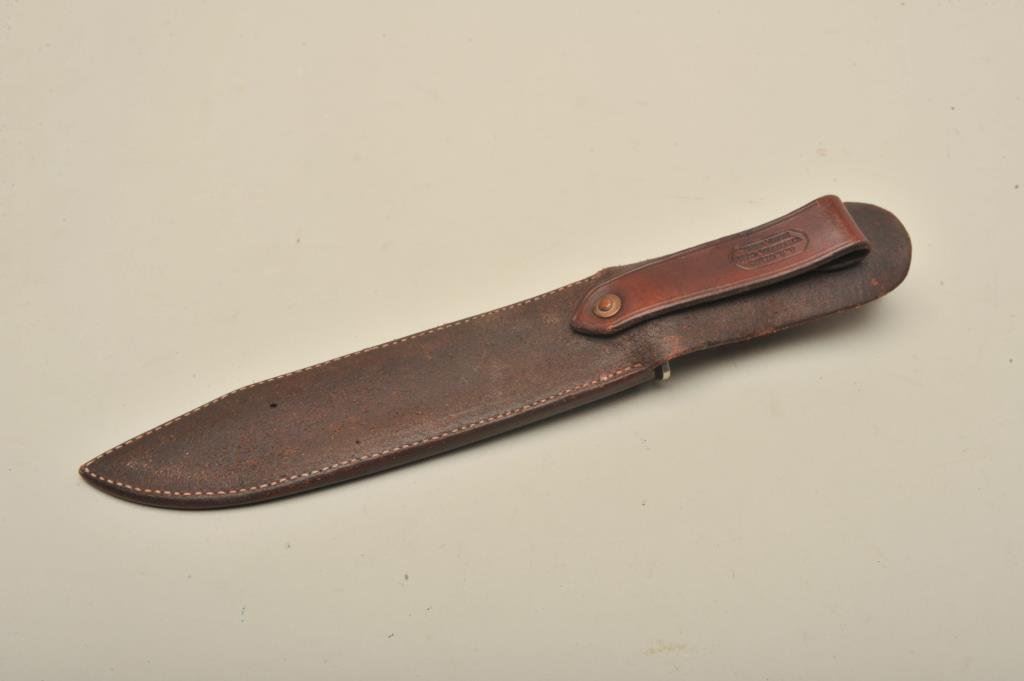 stag grip and tooled scabbard. 12.25" overall 8" blade. Antique finish. Very good plus.