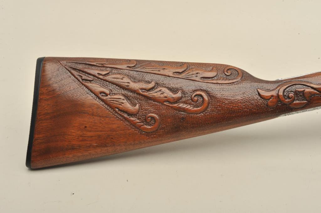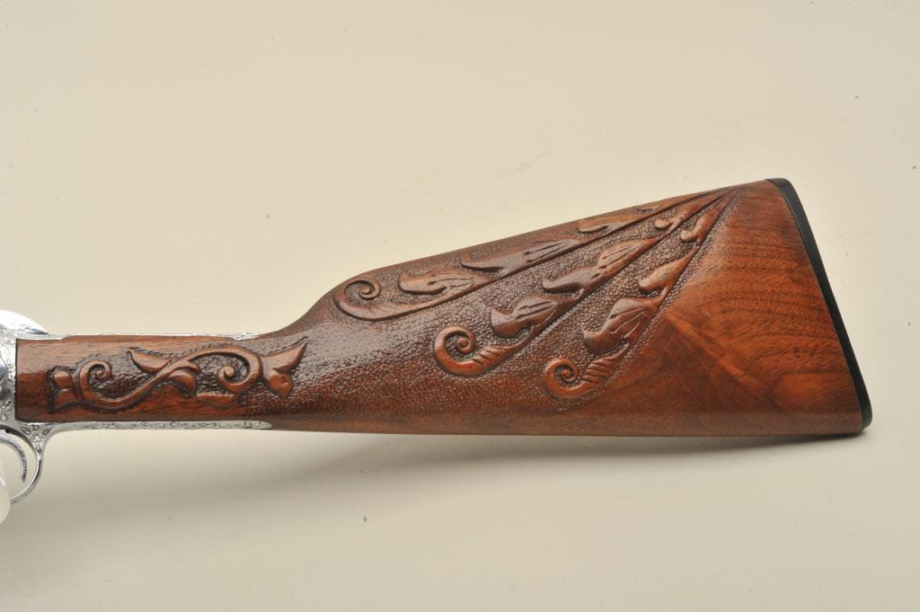 plated, with carved wood stock, S/N 325086. This rifle shows American eagle on the left of the frame and protecting scene on the right. Elaborate scrolls and bright nickel plate. Western style carved stock. Good action and good bore. Work and looks 1950s-60. (C&R) Est.: $500-$1000