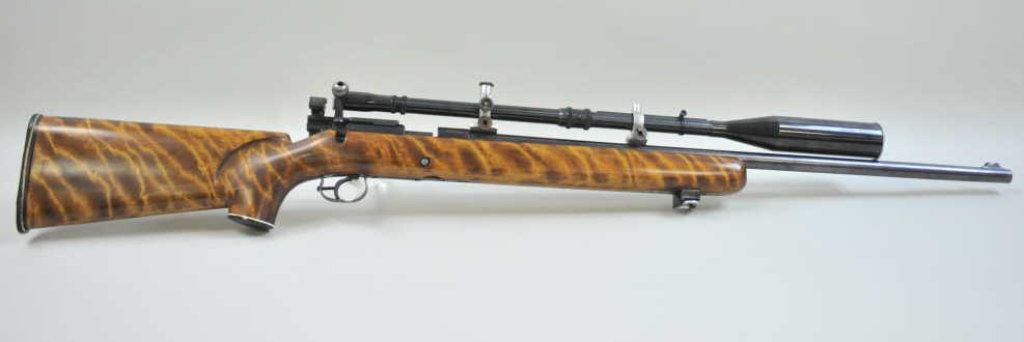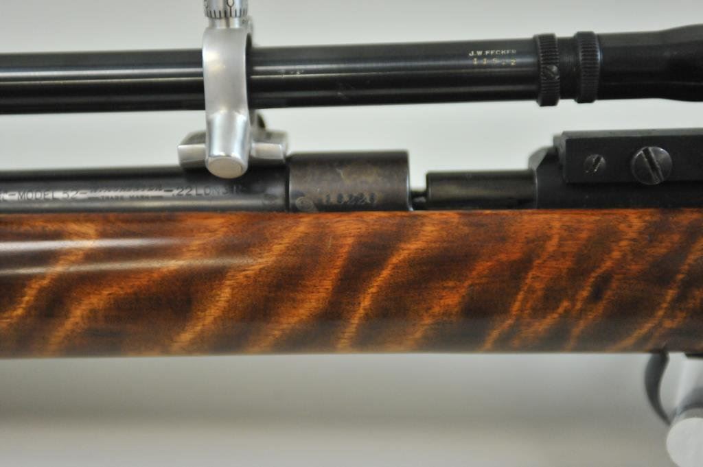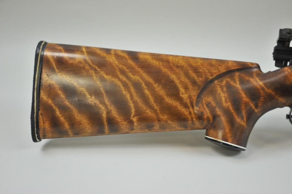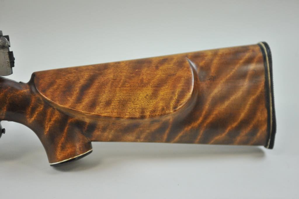 Monte Carlo stock, Marbles peep sight, with J. W. Fecker scope #11912. Rifle is in very good condition, bore is very good, action is very good, sight base dovetailed into receiver, butt pad showing signs of age. (C&R) Est $700-$1400