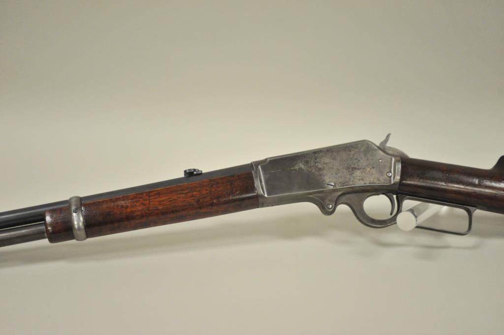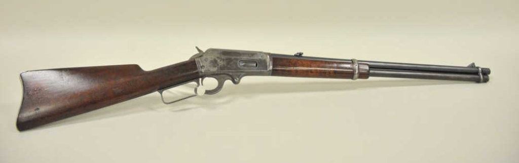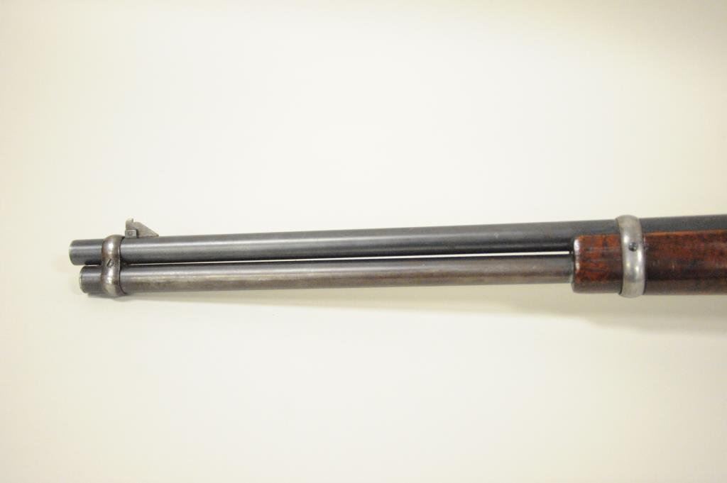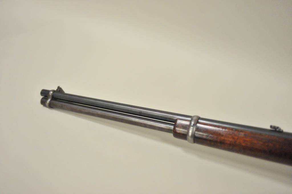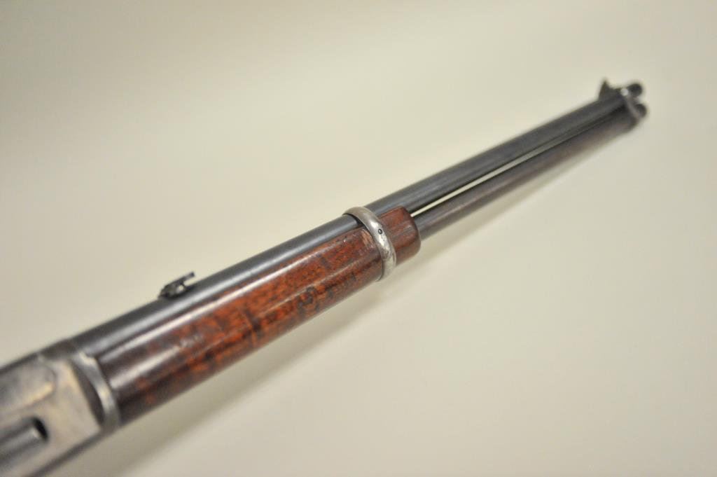ring in .30-30 caliber, S/N 336186. Period added folding rear sight and extra high front sight in original dove tail and bases. 75%-85% original blue with 20%-40% case hardening with some rainbow hues mixed in. The wood is good with scratches and darkening from oil. The action is good and the bore is good. A good carbine. (C&R) Est.: $350-$700