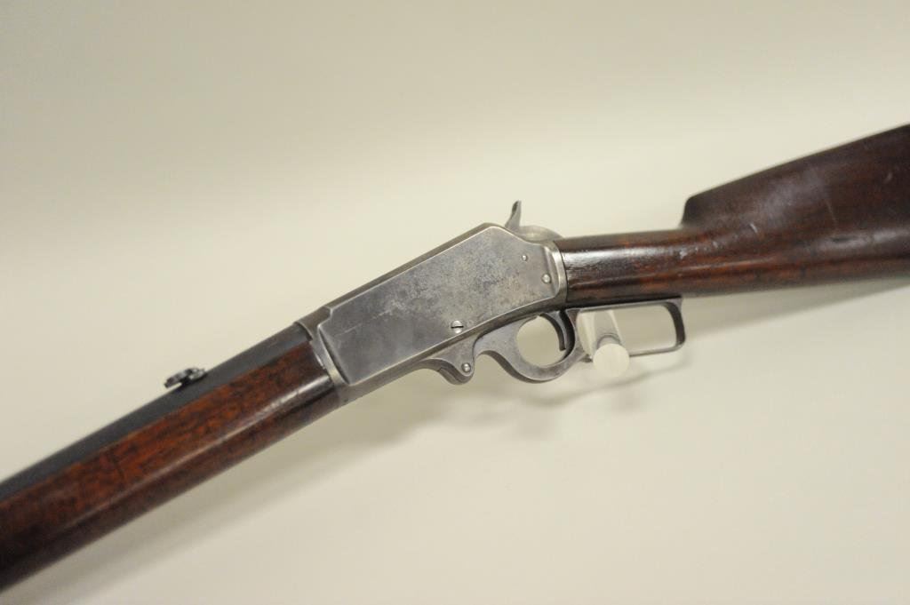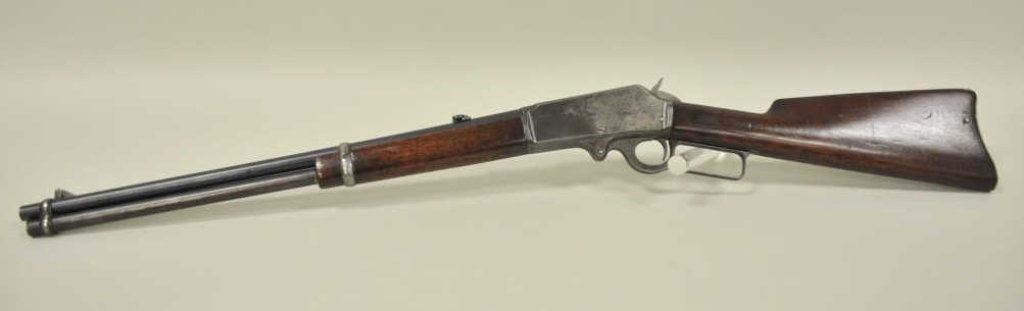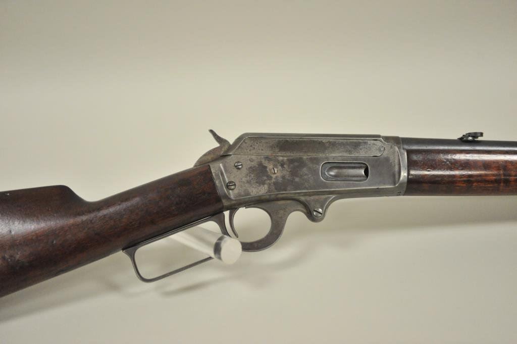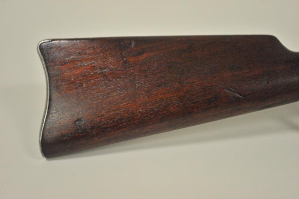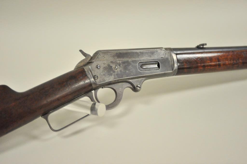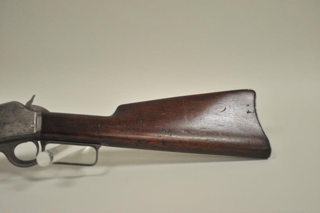 ring in .30-30 caliber, S/N 336186. Period added folding rear sight and extra high front sight in original dove tail and bases. 75%-85% original blue with 20%-40% case hardening with some rainbow hues mixed in. The wood is good with scratches and darkening from oil. The action is good and the bore is good. A good carbine. (C&R) Est.: $350-$700