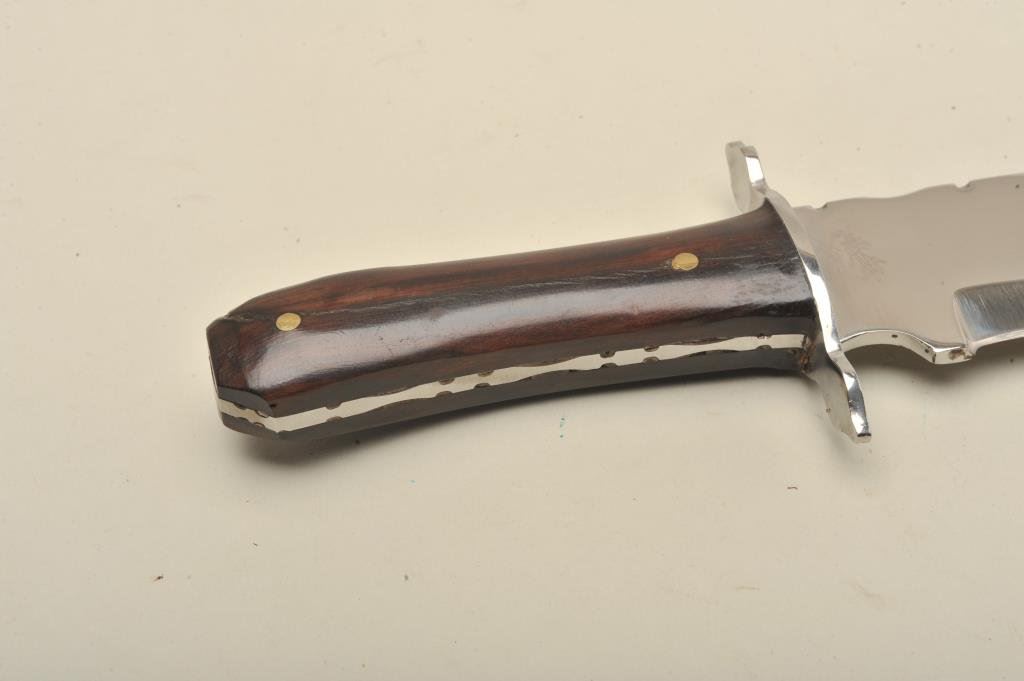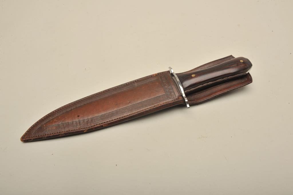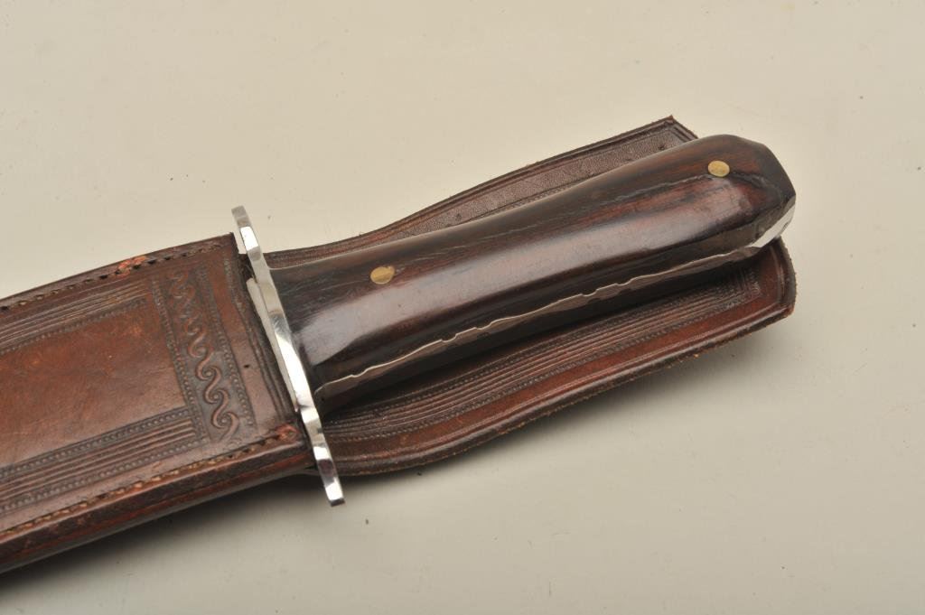 marked Giles, Virginia city, Montana. 14" overall, 9.25" blade, fancy wood scales in coffin shape. Shows slight sharpening. Very good plus.