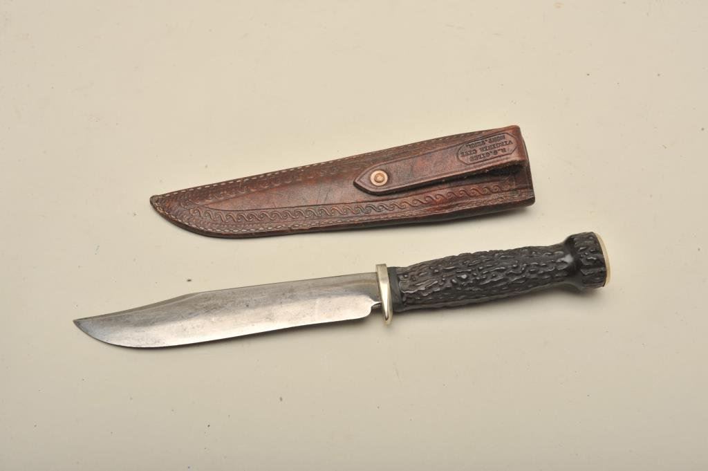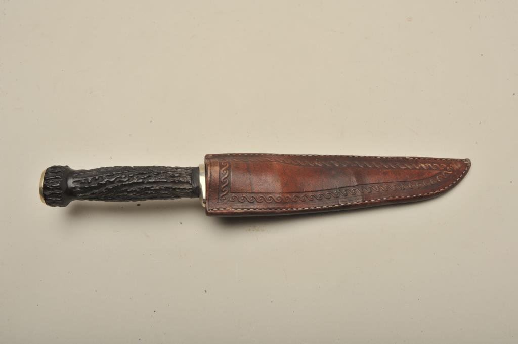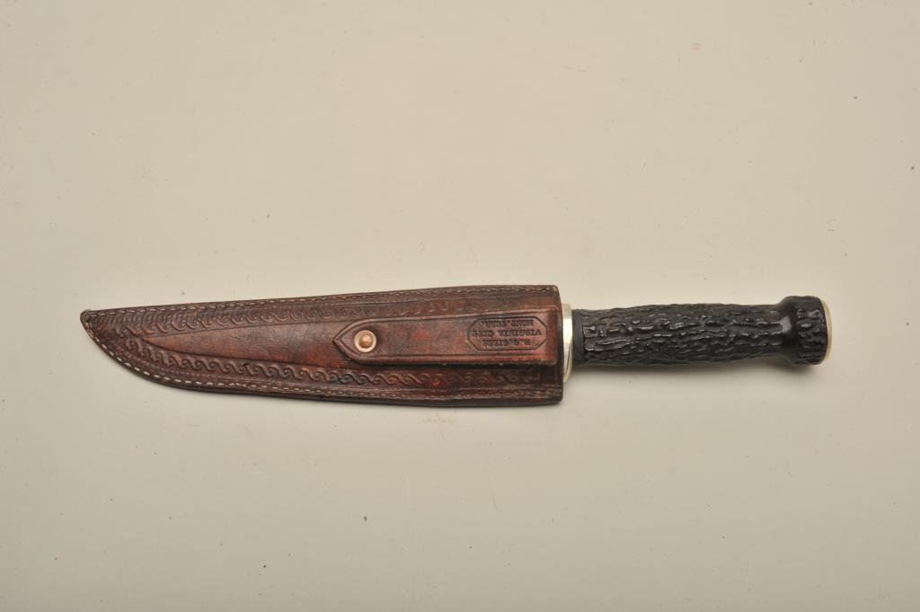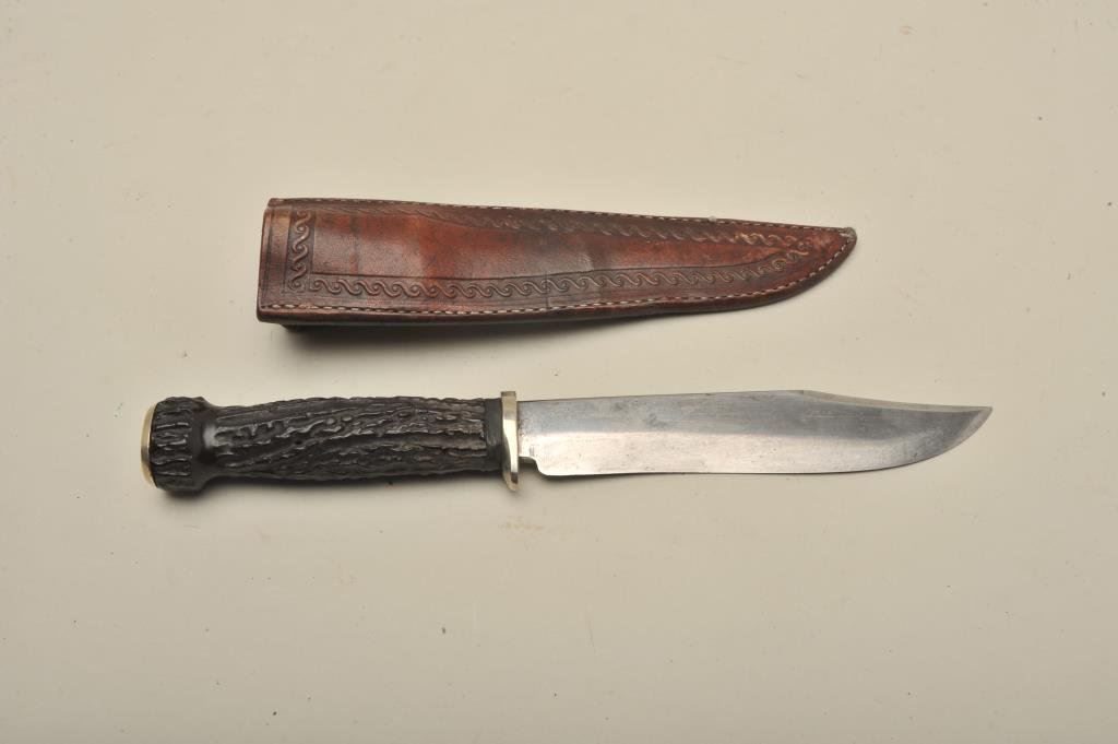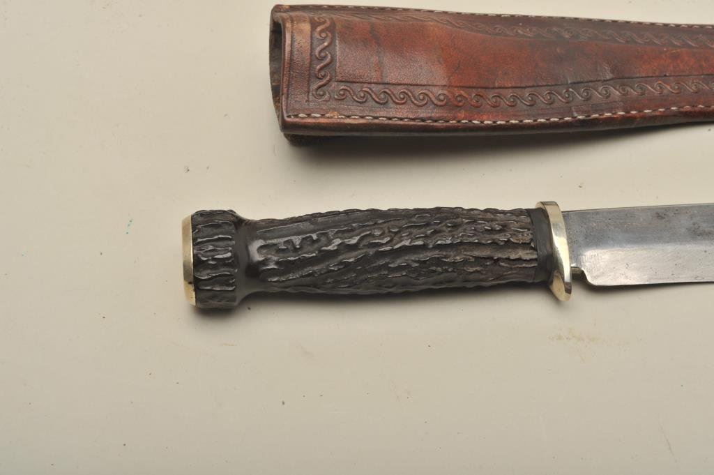 buffalo hunters and pioneers. Marked universal hunting knife. Dark red stag grip. Original tooled scabbard. Blade sharpened and reduced slightly. Very good overall condition.
