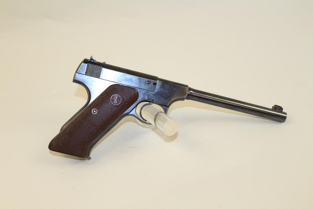 plastic Elephant Ear style grips. Pistol is in fine to excellent condition, showing 95-97% original finish, thinning at the muzzle and high points. Bore and action are excellent. One Woodsman marked magazine. (C&R/PPT) Est.: $300-$600