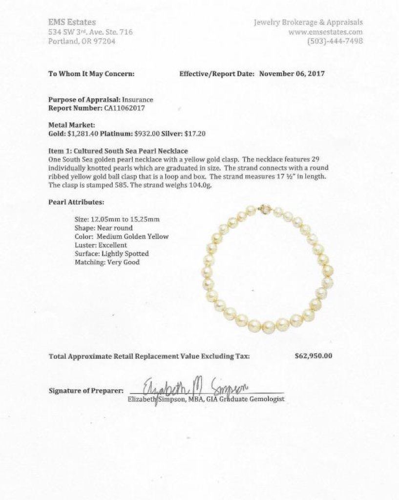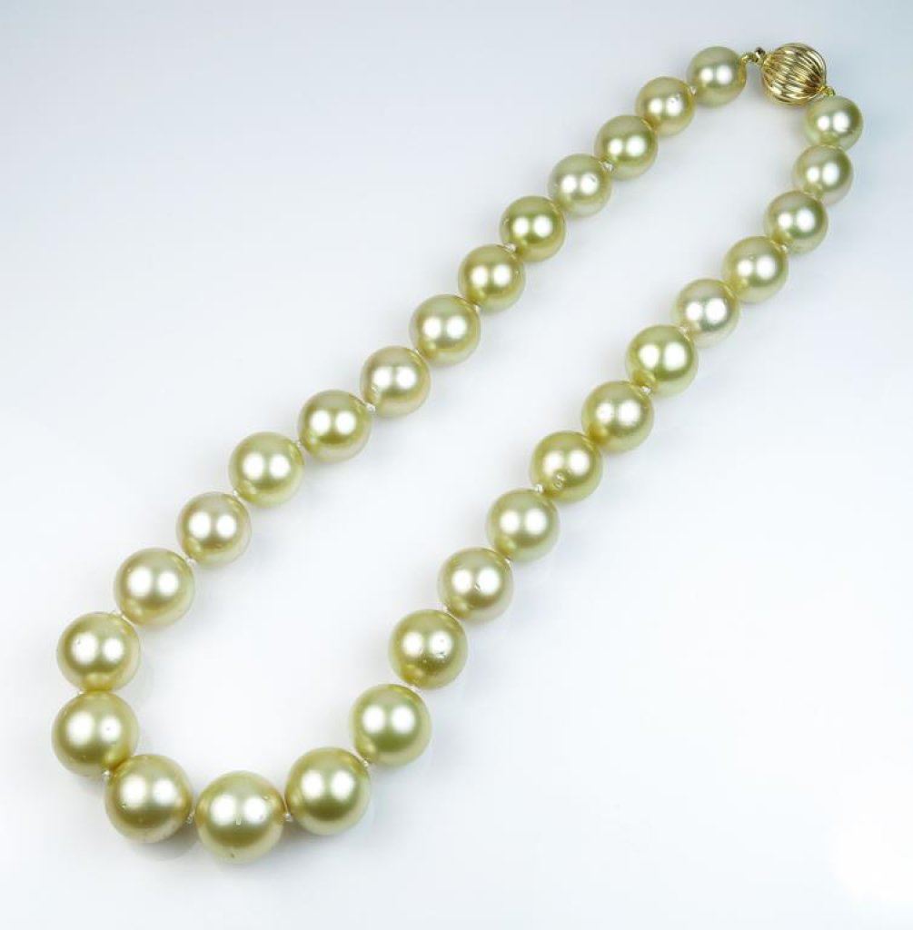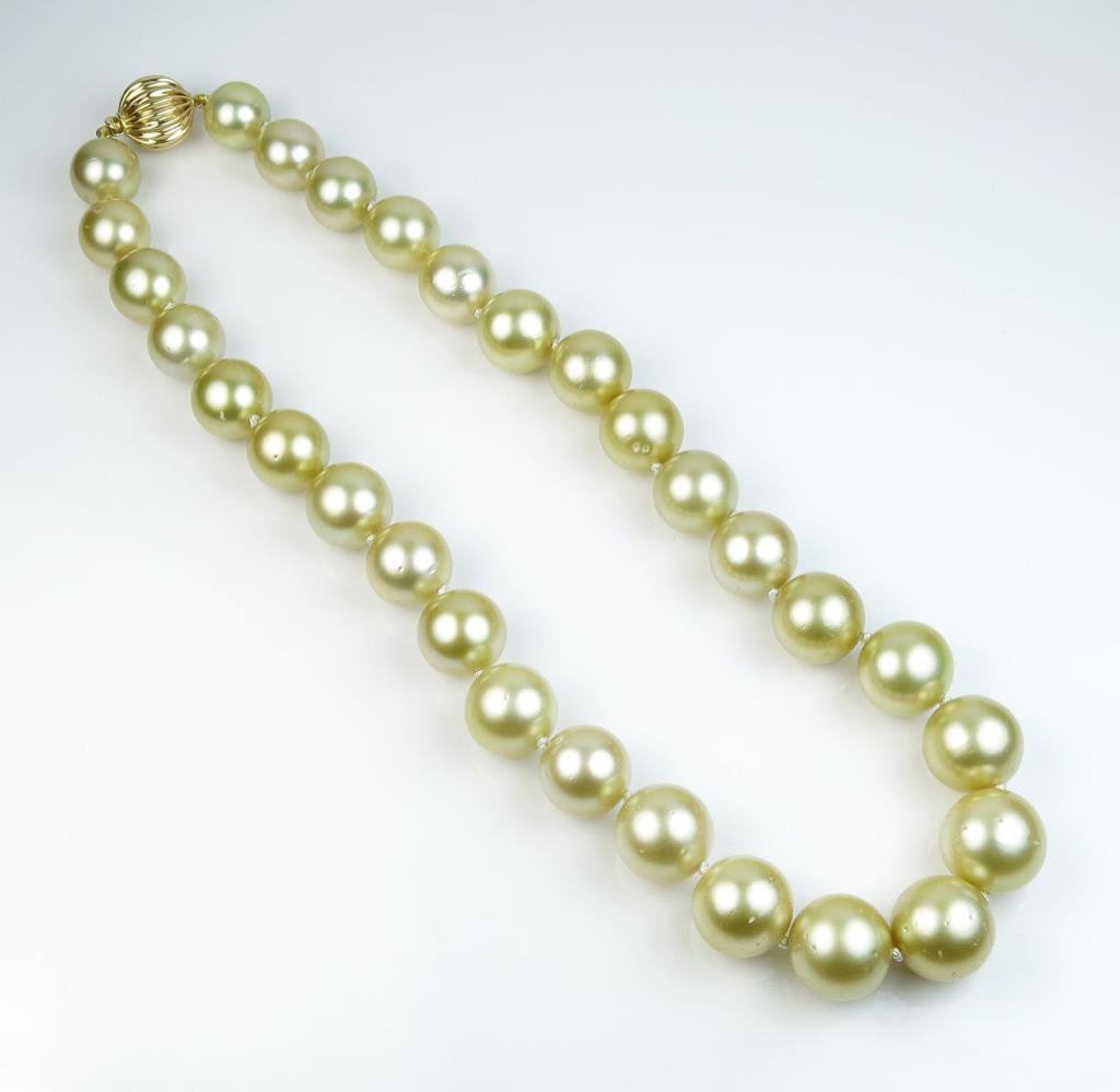 Amazing strand of Natural Golden Tahitian South Sea Pearls very good matching combination and excellent luster ranging from 12.00MM to 15.25MM in diameters with 14 karat yellow gold clasp. Full Retail Appraisal at $62,950.00 Est:$8000-$15,000