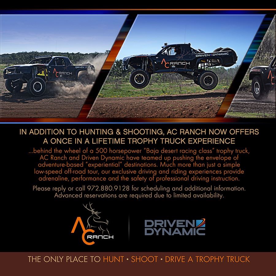 Travel to AC Ranch in El Dorado, Texas for a 3 day/2 night combination Axis buck and Rio Grande turkey hunt for one hunter and one observer. AC Ranch is the only place you can hunt, shoot, and drive a trophy truck! This 1:1 hunt can be taken through December 31, 2018 and can be taken with either a rifle or a bow. Extra hunters may be added for $250/night for lodging, $150/day guide fee, plus the trophy fee of the animal taken. Additional observers may be added for $200/night. If you fly in, you'll arrive at San Angelo Mathis Field and we will be there to pick you up and drive you to the ranch. Donation excludes airfare to San Angelo, gratuities, meat processing, and taxidermy of trophies. Please call in advance if you would like to upgrade your hunt. If your passion is to harvest a combination of exotics and/or native animals, we're here to make your dream a reality! HSC References: Jan Heilbut, John Pepper, Melanie Pepper, & Emeric Pepper. Houston Safari Club thanks AC Ranch for this 100% donation.
