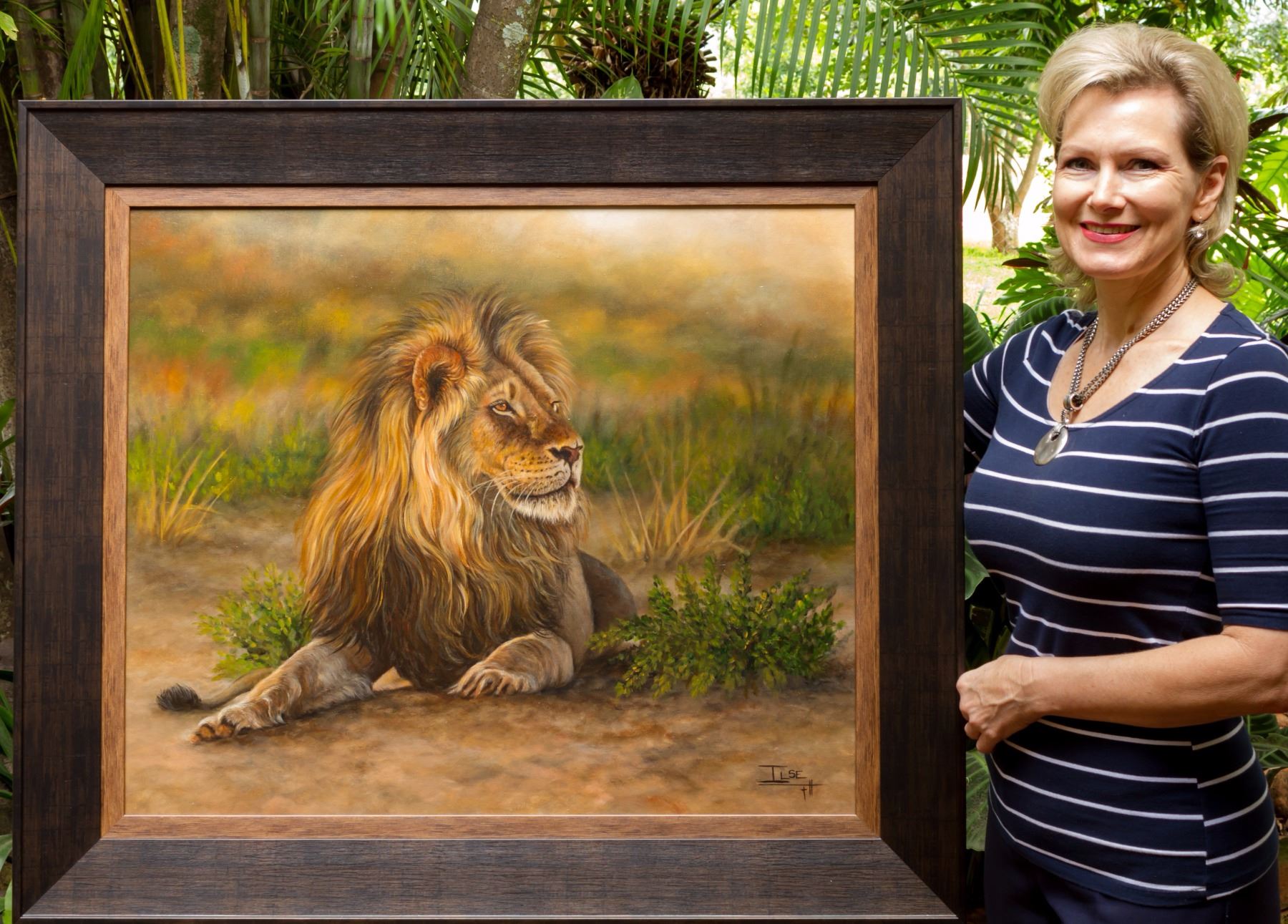 South African wildlife artist Ilse de Villiers has generously donated this original acrylic painting titled "The Look of a King" depicting a resting male lion. Size: 39" x 34" tall (framed). All of Ilse's paintings are unique, and no prints/giclees are made. Houston Safari Club thanks Original Wildlife Art by Ilse for this donation.