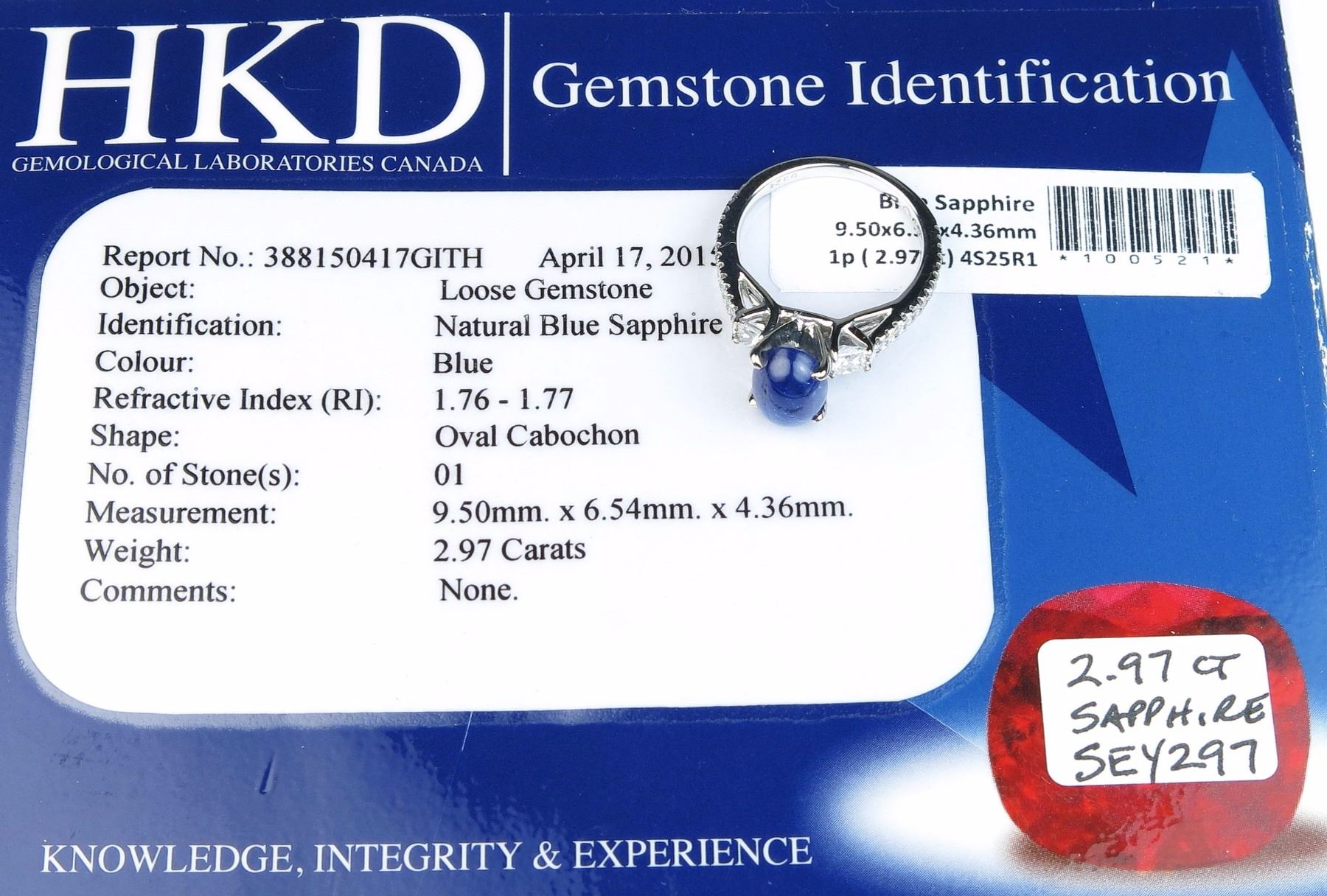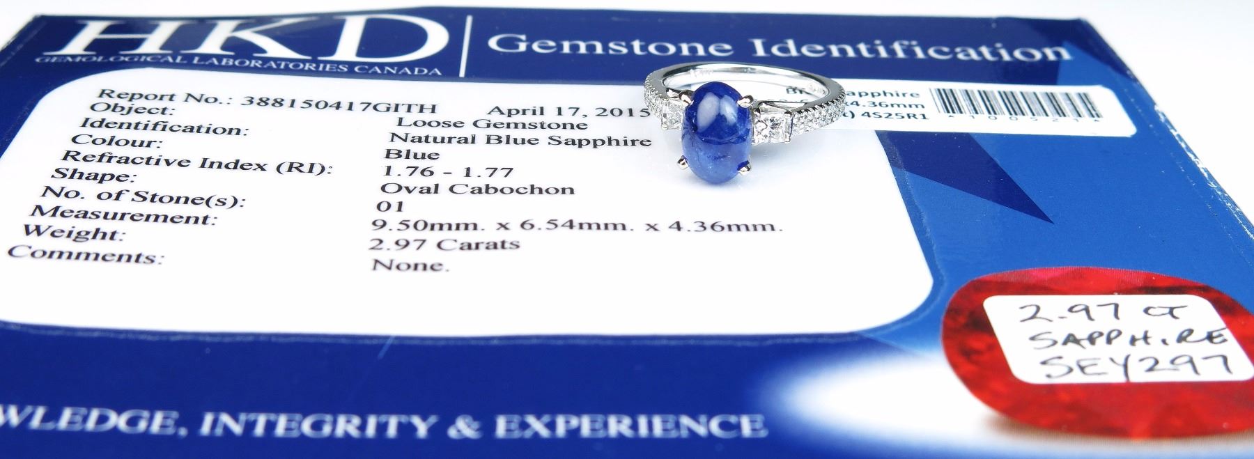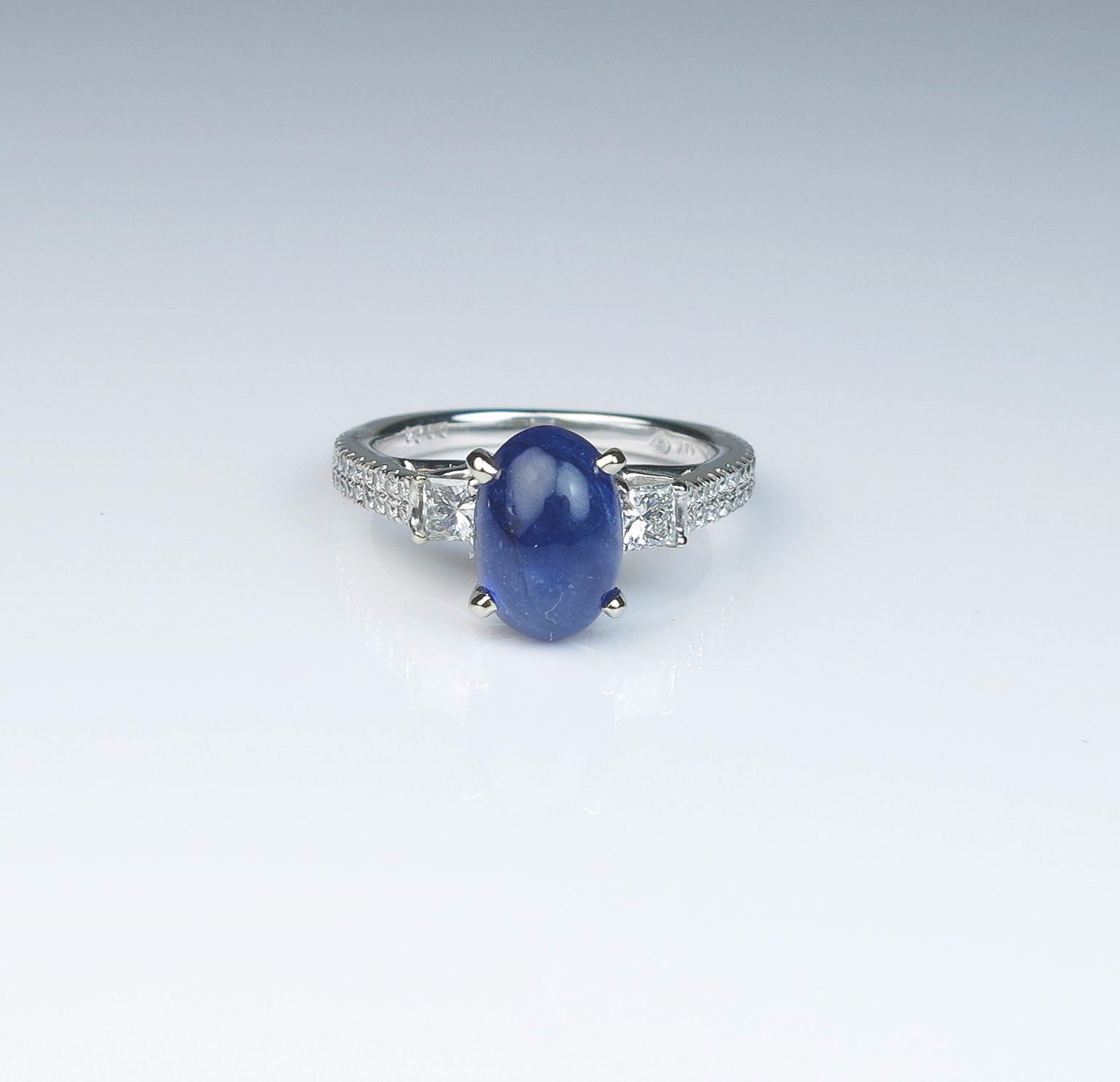 Elegant ring featuring a vivid blue Cabochon sapphire weighing 2.97 carats set with 58 round and princess cut diamonds weighing approx 0.75 carats of G-H colors and VS clarity set in a 14 karat white gold custommade setting. Comes with HKD Gemstone Identification. Retail:$3000-4000 Est:$1500-2000