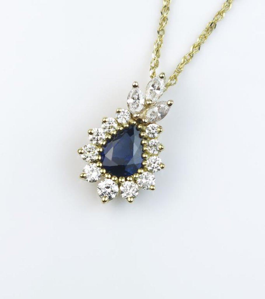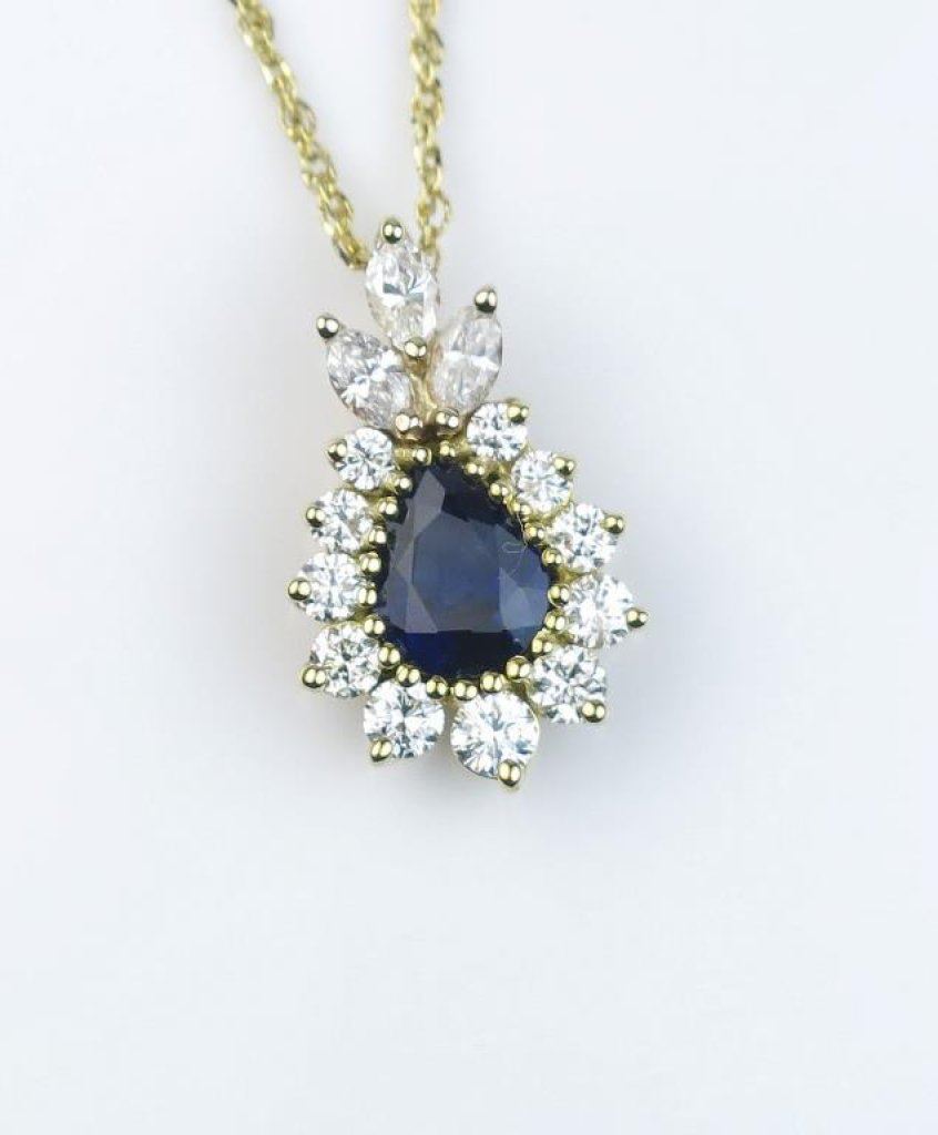 High quality ladies pendant featuring a fine blue Sapphire weighing approx 1.00 carat and surrounded by "IDEAL" cut MQ and round diamonds weighing approx 1.20 carats of F-G colors and VS clarity set in an 18 karat yellow gold setting. Retail:$5000-6000 Est:$3000-4000