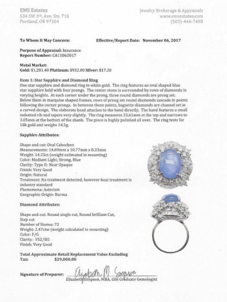Amazing ring featuring a fine Natural Burmese Blue Star Sapphire weighing approx 14.25 carats and surrounded by 72 round and baguette cut diamonds weighing approx 2.50 carats of F-G colors and VS/SI1 clarity set in an 18 karat white gold fashion design ring. Full Retail Appraisal at $29,000.00 Est:$8000-$12,000