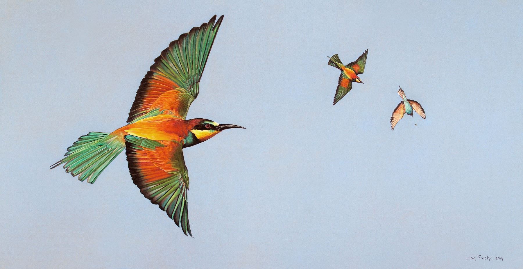 Renowned wildlife artist, Leon Fouche, is donating this beautiful 25x14 soft pastel. Without a doubt one of Africa's most beautiful birds. Bee-Eaters provide an unrivaled display of color and aerial artistry. Houston Safari Club thanks Fouche Studios for this donation.