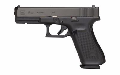 Glock, 17 Gen 5, Safe Action, Full Size Pistol, 9MM, 4.49" Marksman Barrel, Polymer Frame, Matte Finish, Fixed Sights, 17Rd, 3 Orange Follower Magazines, Glock OEM Rail, Ambidextrous Slide Stop Lever, Flared Mag Well, nDLC Finished Slide and Barrel, No Finger Grooves