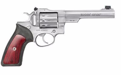 Ruger, GP100, Double Action Revolver, 22LR, 5.5" Barrel, Satin Stainless Finish, Rubber Grips with Wood Inlay, 10Rd, Adjustable Fiber Optic Sights