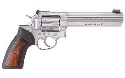 Ruger, GP100, Double Action Revolver, 357 Magnum, 6" Barrel, Satin Stainless Finish, Black Rubber & Engraved Wood Grips, 7Rd, Adjustable Rear Sight & Fiber Optic Front