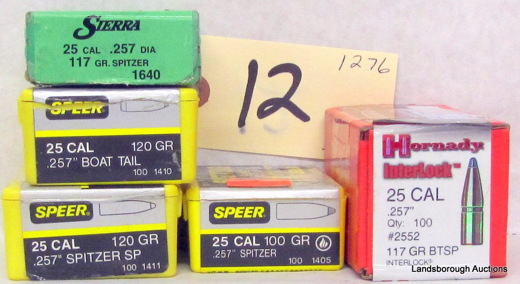 84 PCS SIERRA 25 CAL .257 117 GR SPITZER, 90 PCS. SPEER 25 CAL .257 120 GR. SPITZER, 91 PCS. SPEER 25 CAL .257 100 GR. SPITZER, 9 PCS. SPEER 25 CAL 120 GR. BT, 44 PCS. HORNADY 25 CAL .257 120 GR. BT