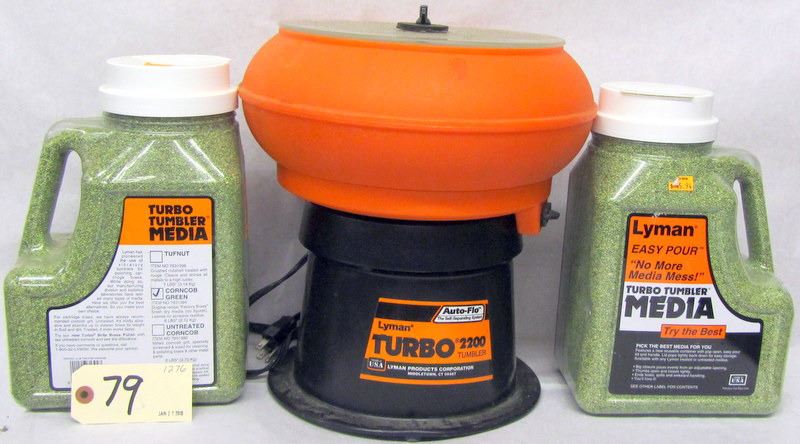 LYMAN 2200 TUMBLER, TWO 6 LB CONTAINERS OF CORNCOB GREEN TURBO TUMBLER MEDIA