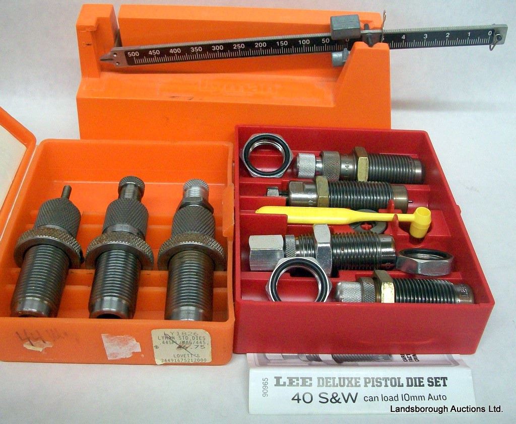 FOUR PARTIAL CONTAINERS PROPELLANT, LEE DELUXE 40 S&W DIE, LYMAN 44 SPL/MAG DIE. PART OF A LYMAN SCALE. IMI HAND GUARDS.