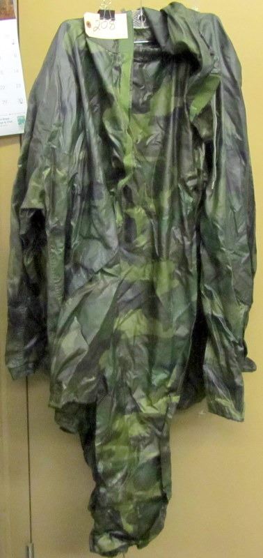 CAMO RAIN SUIT NOT IN GOOD SHAPE, CAMO RAIN COAT FLEECE LINED SIZE L, BUG SHIRT, 2 SMALL GREEN PACKS STAINED, 1 PR CAMO FLEECE GLOVES, 3 CAMO TURKEY HUNTING MASKS, SMALL CAMO TARP