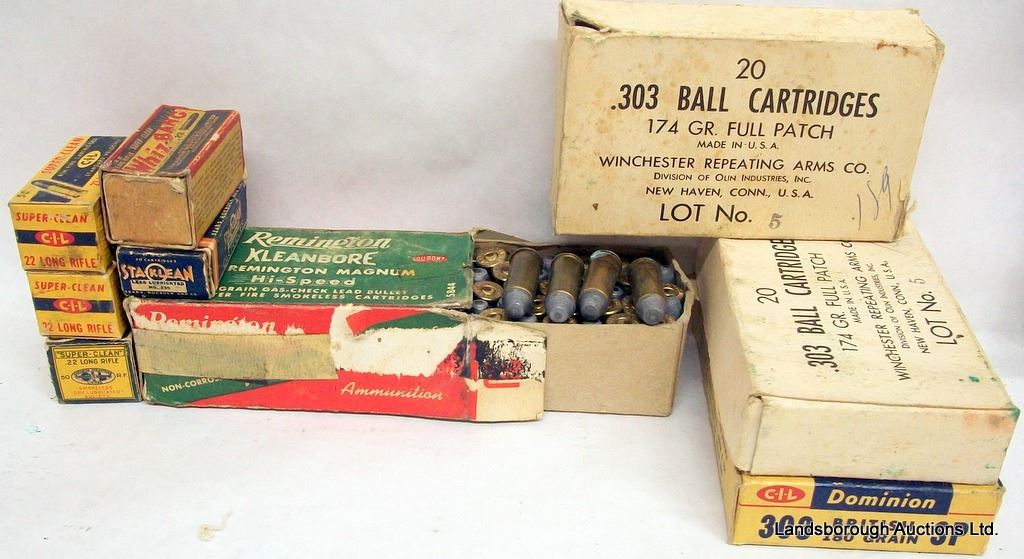 54 RNDS 44 S&W SPL WITH ABOUT 50 BRASS, 20 RNDS DOMINION 303 BRITISH, 32 RNDS 303 MILITARY, 156 CIL 22LR, 50 RNDS SEARS STAKLEAN 22LR.