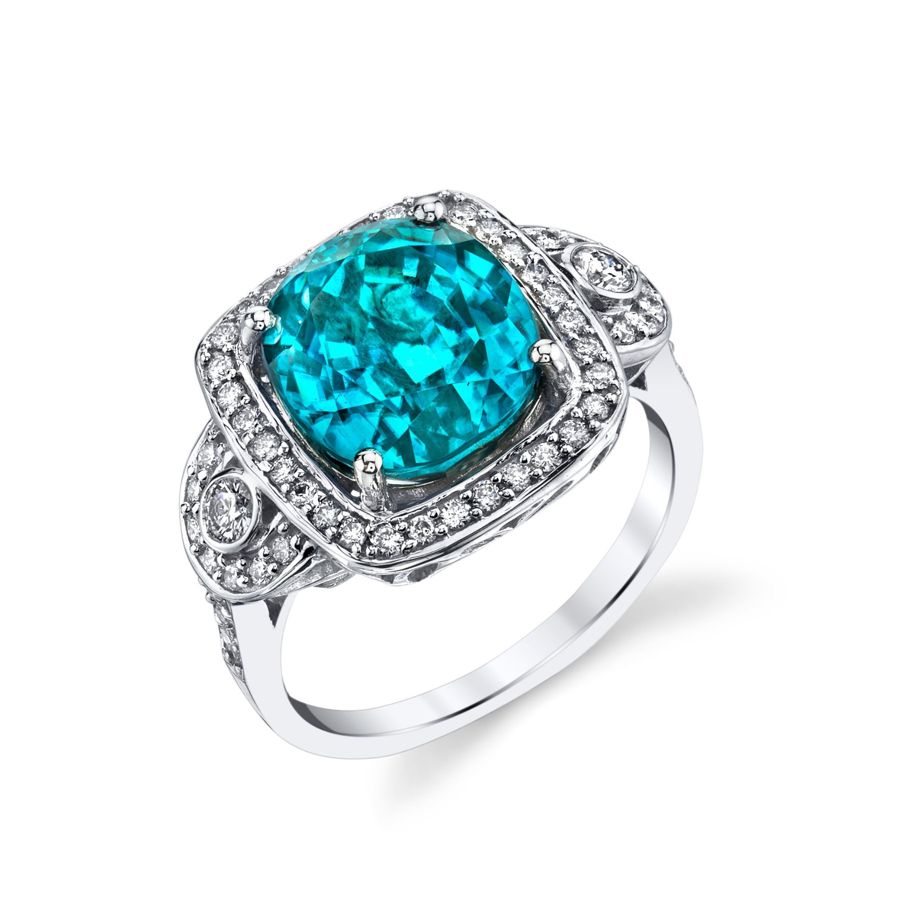 Donation: Natural blue zircon and diamond ring. 8.49 carats of blue zircon. Vivid blueish green in color with .46 total weight in diamonds. G in color
