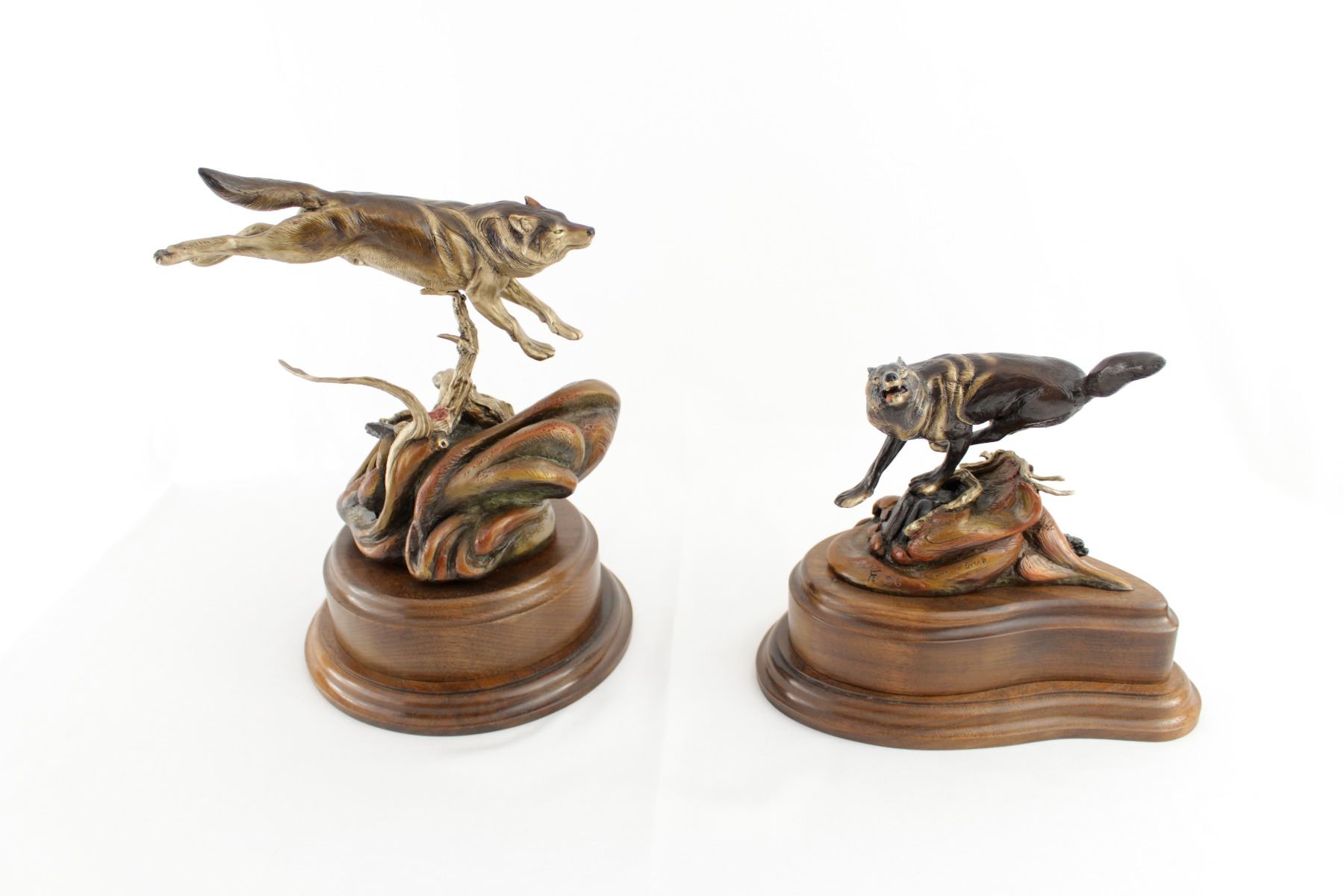 DONATION: "Airborne" and "Land' n Snap" are a set of wolves designed to go with "Full Tilt", a leaping bull caribou, which is an edition size of 36. "Airborne" was tilted from a method of taking wolves for predator control by shooting from an airplane to take a wolf. Harvesting wolves is very important to keeping a balance in wildlife populations for healthy populations of both wolves and prey. This piece is dedicated to sound wildlife management and the truth about predators without sensational emotionalism and untruths. Wildlife managers keep careful watch over populations.