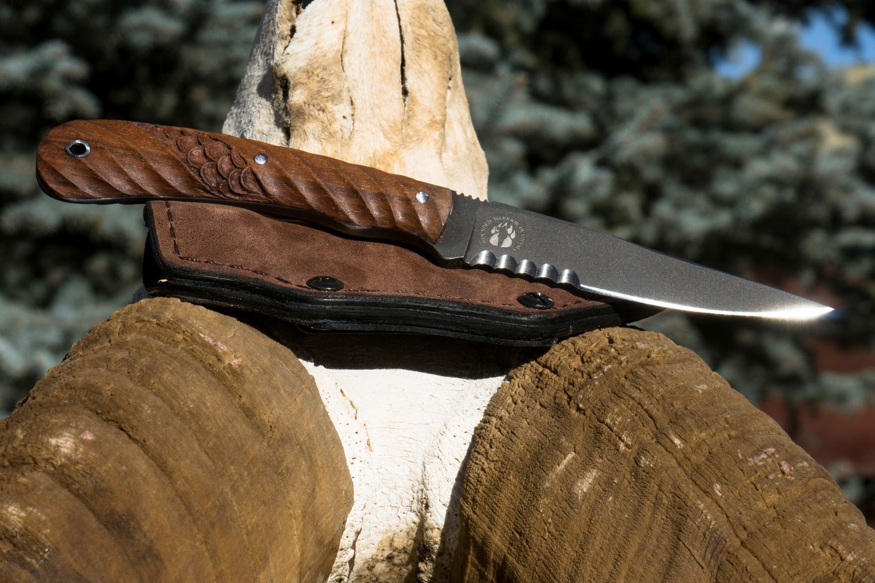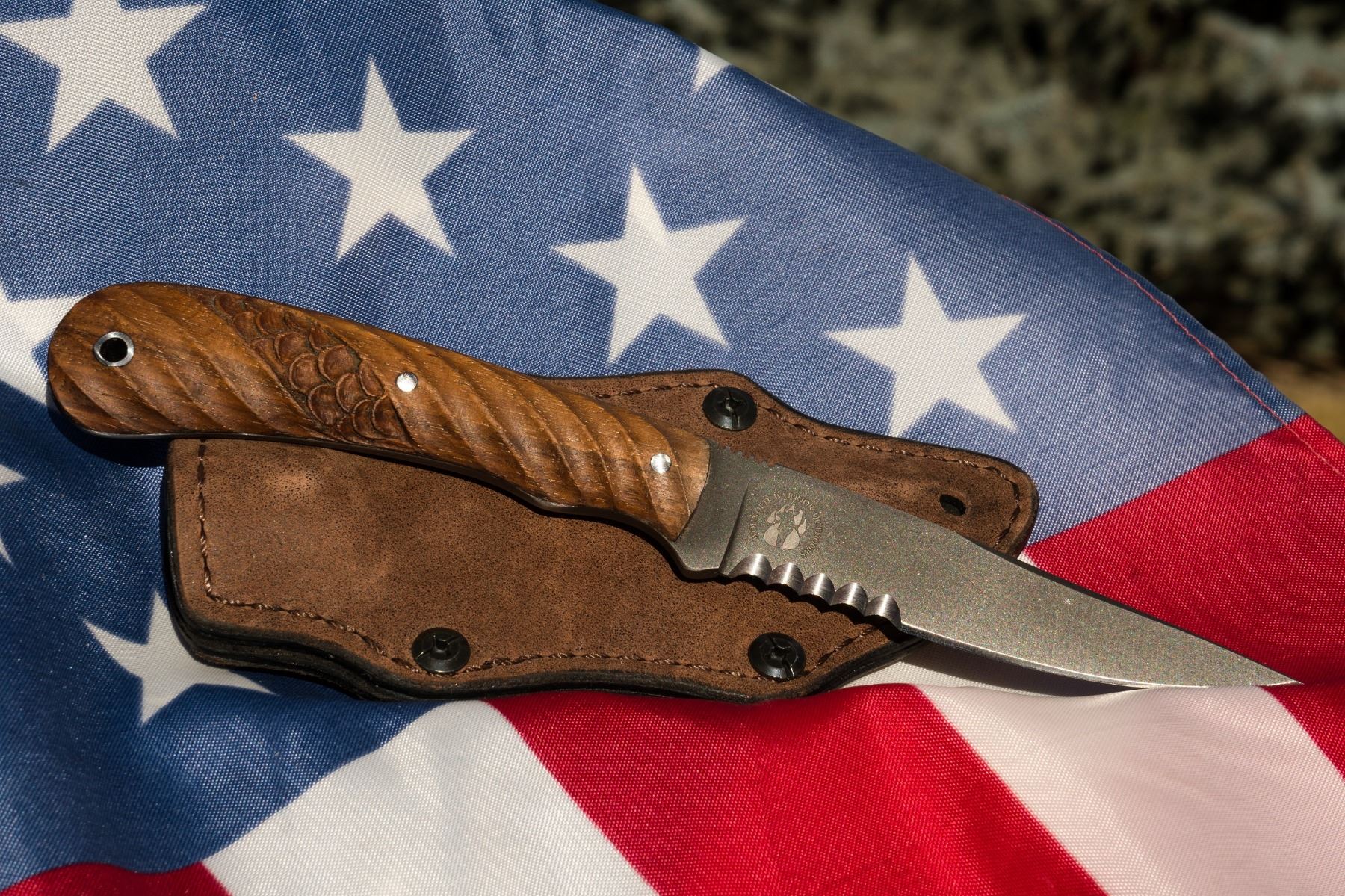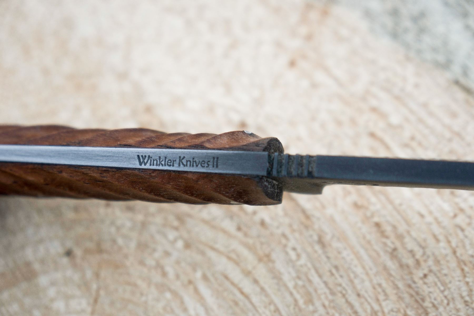 “The Operator is the result of a question asked of veteran Kevin Holland who spent more than nineteen years serving as both a Navy SEAL and Army SOF Operator. Daniel Winkler asked Kevin what he would consider to be the perfect knife based on his experience. The 8.5” fixed blade knife is the result of the combined knowledge of the two men - Kevin as a skilled Operator and Daniel as a skilled Knifemaker. The knife features a tapered tang and 4” blade with a distal taper. Designed for quick action and deep penetration, the knife comes with a black or brown leather sheath that can be worn horizontally or vertically. Available only with Caswell No-Glare finish. The walnut handle is unique as it was crafted from the walnut stock of an enemy combatant’s weapon. During his decades of deployments with both the Navy and the Army, Kevin would notice that the stocks on many weapons used by The Taliban and Al Qaida resembled the wood on the handles of the axes and knives Daniel made. Kevin was able to procure some of that “special walnut” to be used as handle material for the knife on display before you today.”