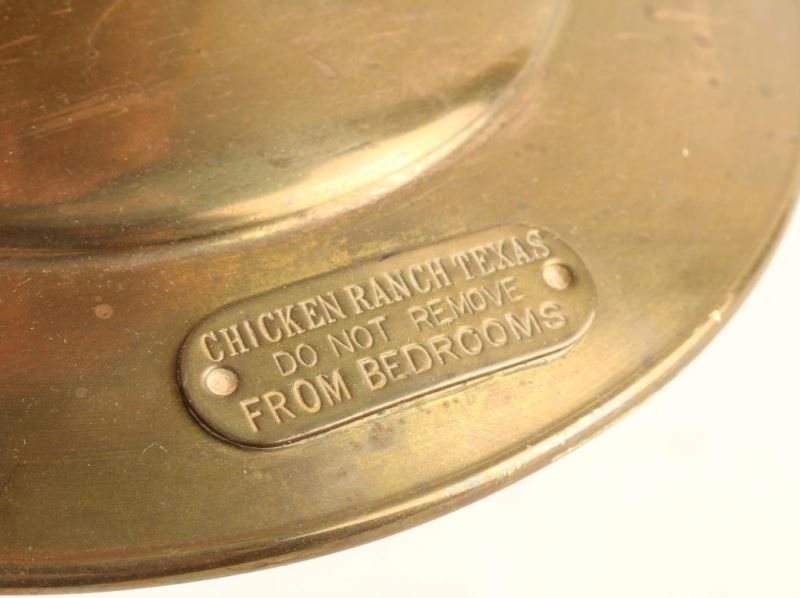 Brass base and arm with a green glass shade. Has a plaque that reads "Chicken Ranch Texas, Do Not Remove from Bedrooms".