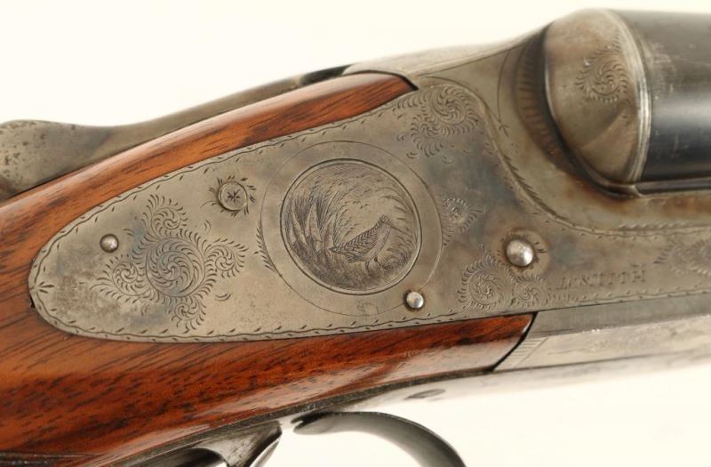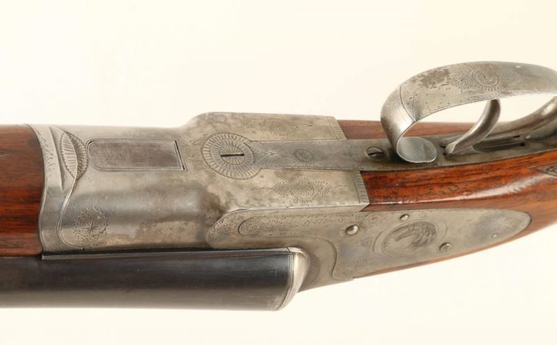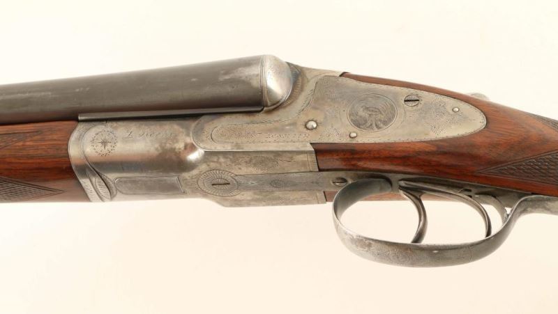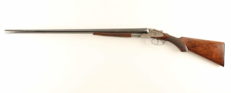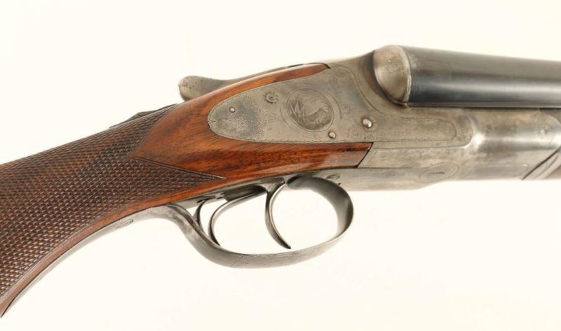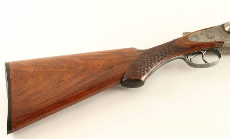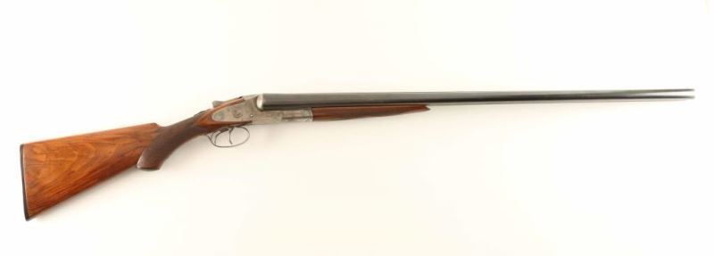 High quality American made side-by-side double barrel sidelock shotgun chambered for 12 gauge shells, circa 1898. Features 30" blued barrels with a raised matted rib & no barrel address, extractor, double triggers, silver bead front sight, case hardened receiver with engraved scroll patterns & game bird scenes including a woodcock on the right side, checkered top lever, sliding tang safety, fancy checkered walnut forend with ebony inlay at the tip & hard plastic medallion with a dog's head motif inlayed in the center, and pistol grip shoulder stock with black grip cap, unmarked serrated buttplate & 14 1/8" LOP. The receiver has been inscribed with the name "L. Keehn" on the left side. The shotgun exhibits approximately 67% of it's original finish overall showing dulled case colors on the receiver with wear on the underside from use and thinned bluing on the barrels showing wear on the rear portion from carrying, muzzle wear and some scattered areas of wear. Action is crisp, bores are very good, and wood stocks are near fine as refinished. Condition is very good. ***C&R Firearm*** ***Modern Firearm***