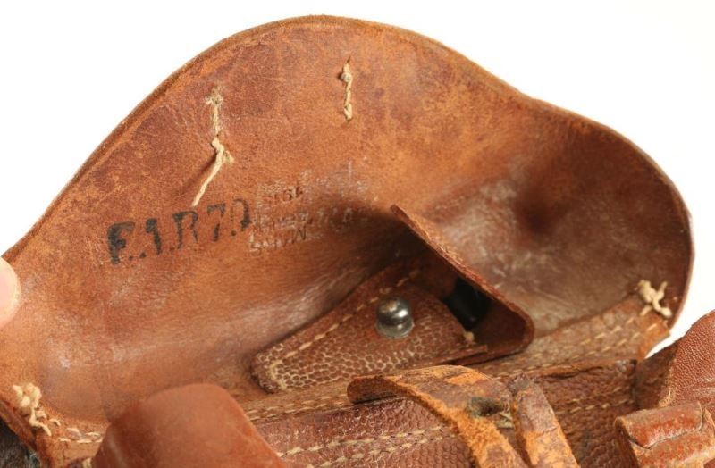 In near fine original condition with matching stock and holster. 90-95% plus original blue with minor losses at muzzle and hi points. Sharp and crisp with most "straw" on trigger, catch and safety. All matching visible numbers except magazine. Grips also near fine with light original color and sharp checkering. The board stock and attachment color are Very Good + with correct matching numbers. Holster is Very Good + dated 1915 on interior with takedown tool and rod. The forward carrier strap is an excellent replacement. A solid 9 on a 1-10 scale for the collector who likes authenticity. *C&R Firearm*