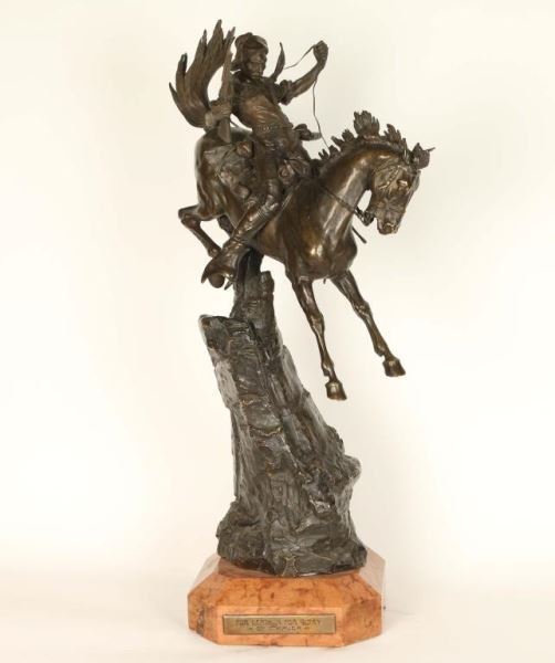 by world famous western artist Carl Kauba (1865-1922) entitled "For Death or Glory" hand signed. Measures 32"h x 10"w x 10"l. on marble base. Carl Kauba was an Austrian sculptor of Western American bronzes specializing in Indians. Kauba was the pupil of Carl Waschmann and Stefan Schwartz in Austria. He traveled widely in the American West, sketching and modeling, about 1895. He returned to Vienna where his Western bronzes were cast for the American market between 1895 and 1912. Small and medium bronzes were sometimes polychromed at the foundry. This is a highly collectable original bronze from a well noted western artist similar pieces have brought upwards of 50,000 in galleries.