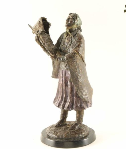 Measures approx 131/2" in height. Entitled "Native American Woman with Papoose" 8/50. A founding member of Cowboy Artists of America, Joe Beeler was a pioneer in the territory of contemporary Western art. He was there at the beginning of the tremendous development of that territory in the early 1960’s. The key event in Beeler’s pioneering activity was the founding, in 1965, of the Cowboy Artists of America. From that association of like-minded people flows a stream of fine art works-making the exhibition eagerly anticipated and commercially successful. Raised in Oklahoma and Missouri, Beeler received his Bachelor of Fine Arts degree from Kansas State Teachers College and continued his studies at the Art Center School in Los Angeles. His professional career began in illustration at the University of Oklahoma Press in Norman. This gave him the confidence to pursue an artist’s career, and collectors were quick to acquire his paintings. The success of his one-man show at the Thomas Gilcrease Museum in 1960 established him on a course that would lead to national acclaim and a string of honors and awards. Numerous medals and awards have been bestowed on Beeler’s work, including gold and silver honors in sculpture, silver in drawing and an Artists’ Choice Award, all from the CAA organization; there are not many artists who can claim such versatility. In 1994, the Arizona Historic League named him an “Arizona History Maker” – an award presented to a very select group of Arizonans. In 1998, Canada’s Cowboys Festival presented “Living Legends Awards” to six individuals in different categories of cowboy culture, and Beeler was the artist honored by the Canadian group.