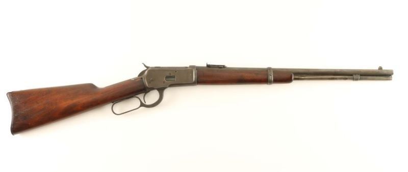 'SRC' Vintage lever action repeating rifle, circa 1917. 20" bbl, full-length tube magazine, blade front sight, flip-up ladder rear sight, saddle ring, metal carbine buttplate and smooth walnut stocks. Rifle exhibits an even dark grey patina with scattered minor pitting. Action is crisp, bore is fait to good and wood stocks are good as slightly shrunken w/ a crack near the top of the buttplate. Condition is good. ***C&R Firearm***