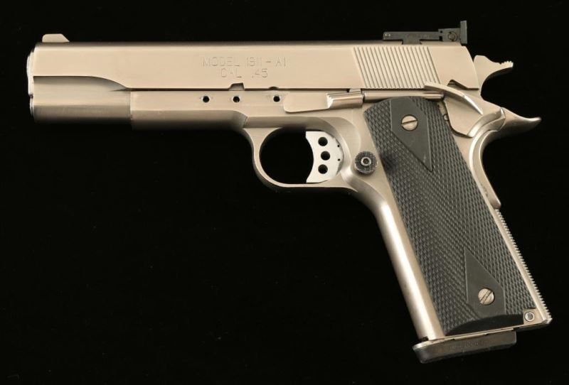 SN: NM91416 Customized stainless steel semi-automatic match pistol. Satin finish, 5" Kart NM bbl, NM marked barrel bushing, blade front sight, Bo-Mar adjustable rear window sight, drilled & tapped frame for optics base, serrated adjustable trigger, serrated hammer spur, extended thumb safety, beavertail grip safety, extended magazine release, Pachmayr magazine, knurled straight mainspring housing, and two-piece double diamond checkered black rubber grips. Pistol exhibits mild handling wear. Action is smooth, bore is excellent and rubber grips are fine. Condition is very good++. ***Modern Firearm***