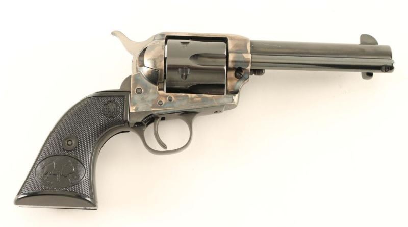 Single-action revolver, manufactured by A. Uberti in Italy circa 2003. Blued/case hardened finish, 4 3/4" barrel, ejector rod, blade front sight, square notched rear sight, fluted six-shot cylinder, smooth wide trigger. knurled hammer spur and two-piece checkered black plastic grips w/ buffalo scene & Beretta decor. Approximately 98% finish intact overall showing a scratch on the top of the barrel and some light scattered wear. Action is smooth w/ very good lock-up, bore is excellent and plastic grips are fine. Condition is excellent. ***Modern Firearm***