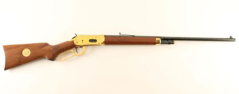SN: LS32382 Commemorative rifle, circa 1970. Blued 26" part octagon bbl, 1/2 length tube magazine, rear sporting sight(missing ramp), brass colored receiver & accent pieces, saddle ring, curved lever, smooth wood forend and pistol grip shoulder stock with inlayed commemorative medallion in the right side. The receiver is drilled & taped for a side mount sight. Includes the original factory Styrofoam box with correct label & sleeve. The barrel exhibits a light amount of scattered surface rust and the receiver shows some minor handling marks. Solis action & bore. Wood stocks are fine. Condition is very good in box. ***C&R Firearm*** ***Modern Firearm***