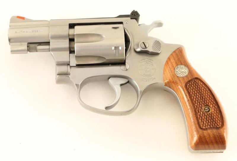 Stainless steel double action revolver chambered in .22 Long Rifle. Features a brushed finish, 2" barrel, ramped front sight with orange insert, adjustable micrometer click rear sight, smooth combat trigger, checkered hammer spur, fluted six shot cylinder with counterbored chambers, round butt J-frame, and two-piece checkered medallion S&W Magna grips. Includes the original factory box with papers, and cleaning equipment. Revolver shows light handling wear and a thin bright ring on the cylinder. Action is crisp, lock-up is very good, bore is excellent and wood grips are fine. Condition is excellent in box. ***Modern Firearm***