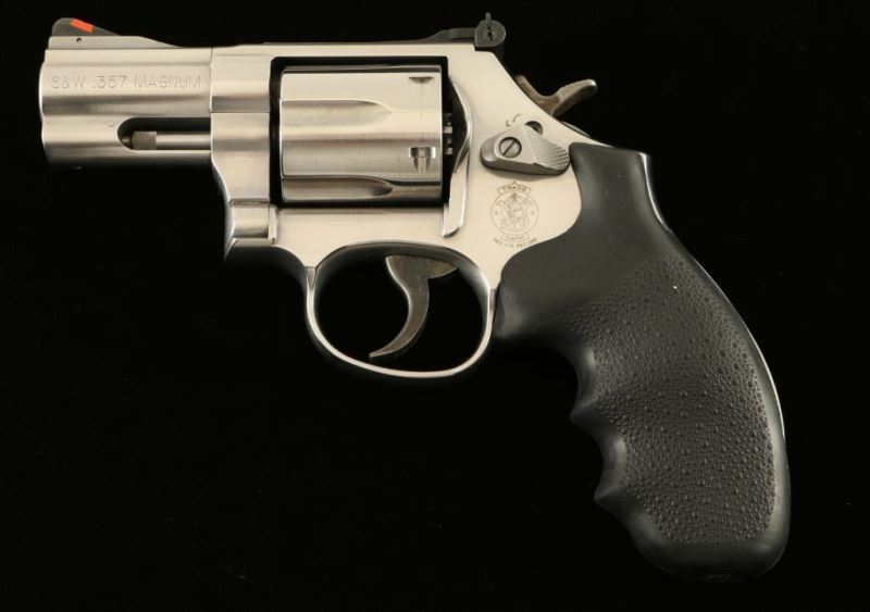 Stainless steel medium frame D.A. six-shot revolver. Lightly polished finish, 2.5" barrel with rib & full underlug, raised ramp front sight w/ orange insert, micrometer click rear sight, internal locking safety, smooth combat trigger, semi target hammer and Hogue pebbled black rubber Monogrip. Includes the original factory hard case with documents. Revolver exhibits a light drag line and minor handling marks. Action is smooth with very good lock-up, bore is excellent and rubber grips are fine. Condition is excellent in case. ***Modern Firearm***