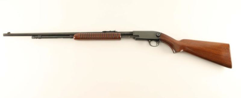 Vintage slide action repeating rifle chambered in .22 Short, Long or Long Rifle, circa 1950. Blued finish, 24" barrel, 3/4 length tube magazine, Marble Sheard front sight, adjustable rear sporting sight, take-down receiver, smooth trigger, push button safety, grooved walnut slide handle and smooth pistol grip shoulder stock with knurled metal buttplate. Approximately 90% bluing intact overall with light edge wear, some scattered handling marks and slide wear from the pump handle. Action is crisp, bore is pristine and wood stocks are near fine with only minor imperfections. Condition is excellent. ***C&R Firearm*** ***Modern Firearm***