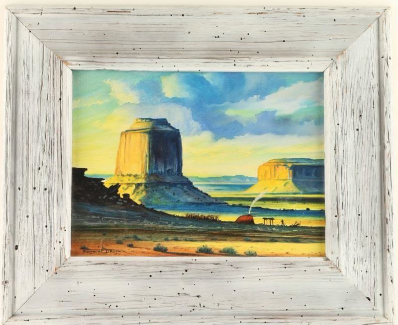Entitled " Monument Valley". Signed by Robert Draper in lower left hand corner, image size is 11 1/4"x8 3/8". Born in Canyon del Muerto, New Mexico, Robert Draper is from the Navajo-Laguna Pueblo. Mainly self-taught, he has worked as an art instructor at the Chinle Boarding School and settled in Chinle. He paints realistic watercolor landscapes and genre of the Navajo Reservation. A favorite subject is Canyon de Chelly. From the age of two, the artist, who was born Robert Martin (son of Janet Descheeny and Frank Martin), was raised by his grandparents whose name was Draper. When he was eight years old and sent to the Chinle Boarding School, the school changed his name to Robert Draper. Robert Draper was born in 1938 on the Navajo (Diné) Reservation. He attended the Chinle, AZ Boarding School and the Institute of American Indian Arts in Santa Fe. Today he is an art instructor and a full-time artist. He is best known for his realistic landscapes of the Navajo Reservation. Source: Robert Lester.