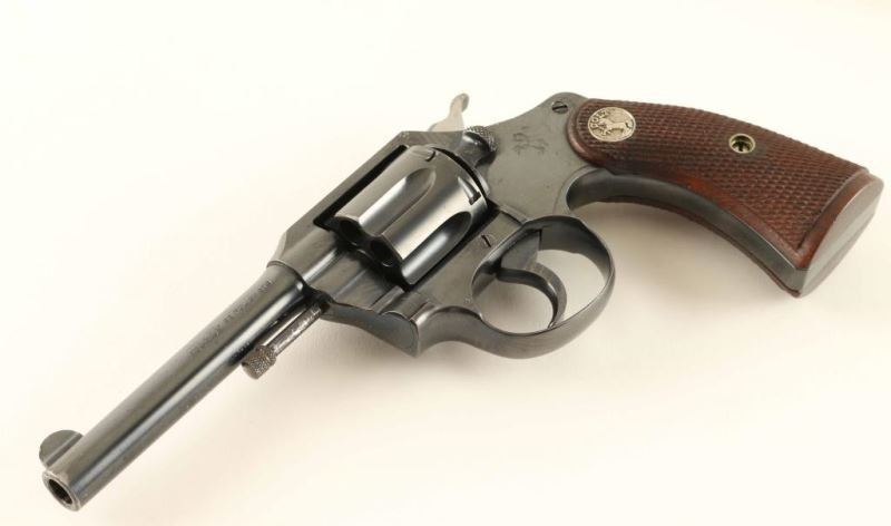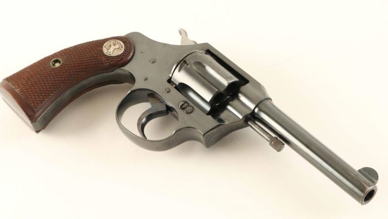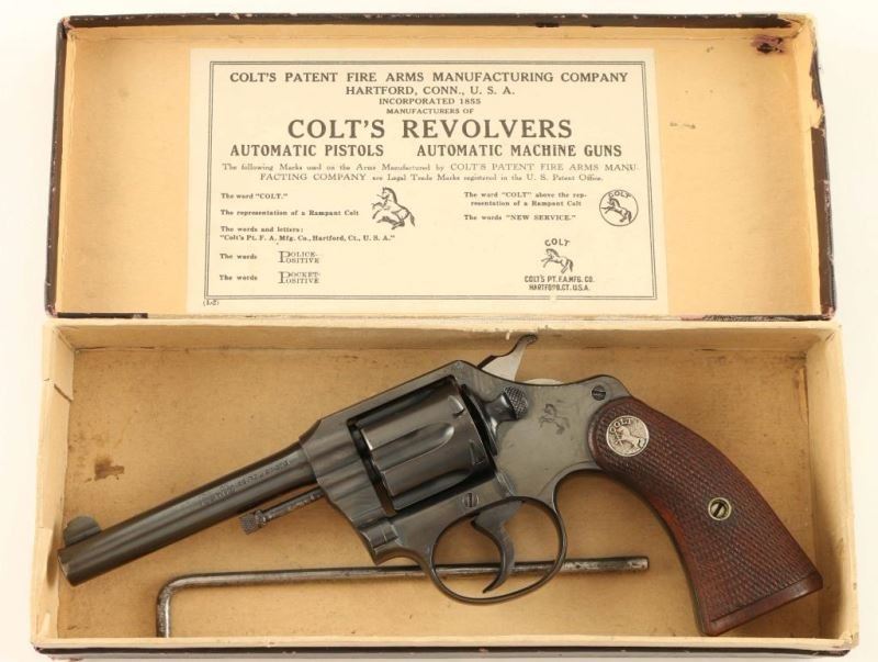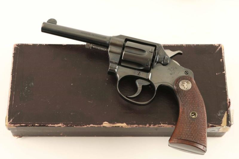 High condition vintage double action revolver chambered in .32 New Police, circa 1924. Original blued finish, 4" barrel, round blade front sight, 'u' notched rear sight, fluted six-shot cylinder, smooth trigger, and checkered walnut two-piece grips with Colt medallions. Includes the original factory box with documents & cleaning tool. Revolver exhibits approximately 93% of it's original blued finish showing a couple dings on the muzzle & front sight, light handling marks, minor edge wear and some blemishes along the edge of the frame on the left side. Action is strong with tight lock-up, bore is bright with sharp rifling & some scattered rust and wood grip are near fine with a small loss to heel of the left panel. Condition is very good. ***C&R Firearm*** ***Modern Firearm***