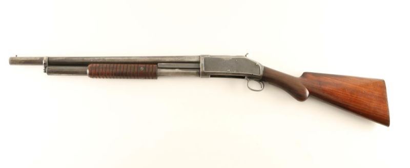 Rare antique shotgun, circa 1893-1897. Original blued finish, cut-down 20" bbl, 2 5/8" chamber, 4/5 length tube magazine, large brass bead front sight, steel receiver, exposed hammer with fancy knurling, smooth trigger, grooved walnut slide handle and smooth pistol grip shoulder stock with metal buttplate. Approximately 20% bluing intact overall showing honest wear with a light amount of pin-prick pitting. Very good markings, smooth action, very good bore and wood stocks are good with some large cracks in the forend. Condition is very good++. ***Antique Firearm***