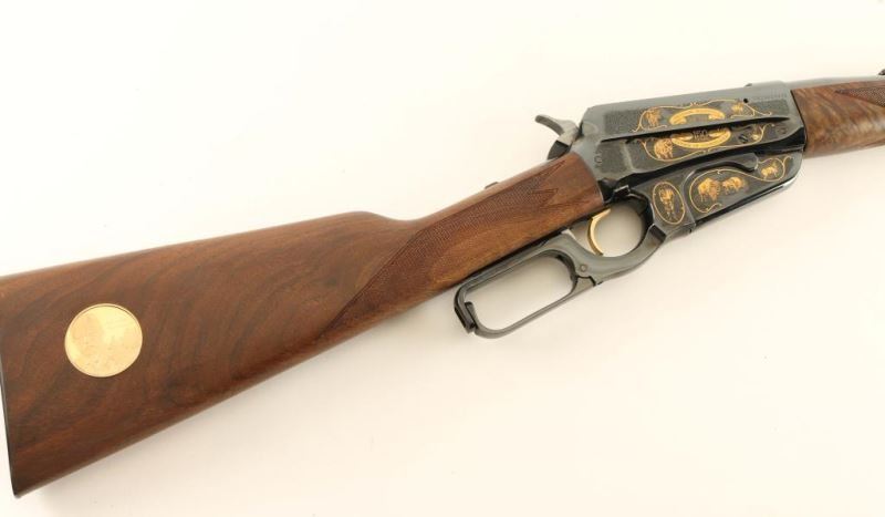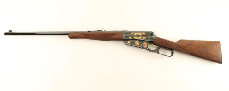 405 Winchester SN: TR150C0019 Highly embellished lever action commemorative rifle, circa 2008. Limited edition Japanese production being 1 of only produced. Features a high polish blued finish, engraved receiver with gold embellished game scenes, standard sights, jeweled hammer, gold trigger, fancy checkered deluxe walnut forend and straight grip shoulder stock with smooth metal buttplate & inlayed commemorative coin. Includes the original factory cardboard box with documents & lock. Rifle exhibits approximately 99%+ of its blued finish showing little to no visible wear. Action is smooth, bore is pristine and figured wood stocks are fine. Condition is excellent in box. ***Modern Firearm***