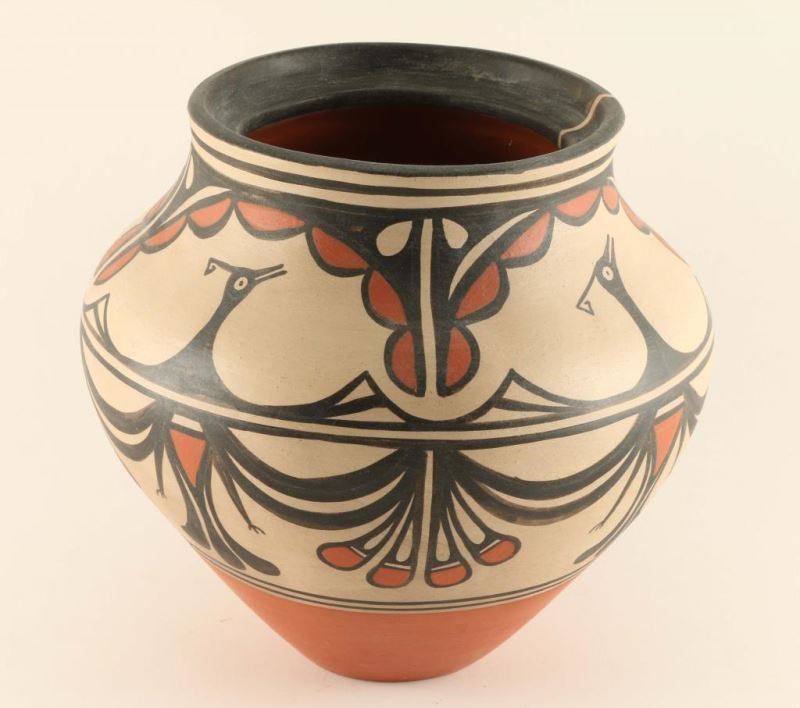 Polychrome jar with a bird design. Measures 14 1/2"h x 10" dia. Signed Santo Domingo, Pueblo, Robert unreadable last name name.