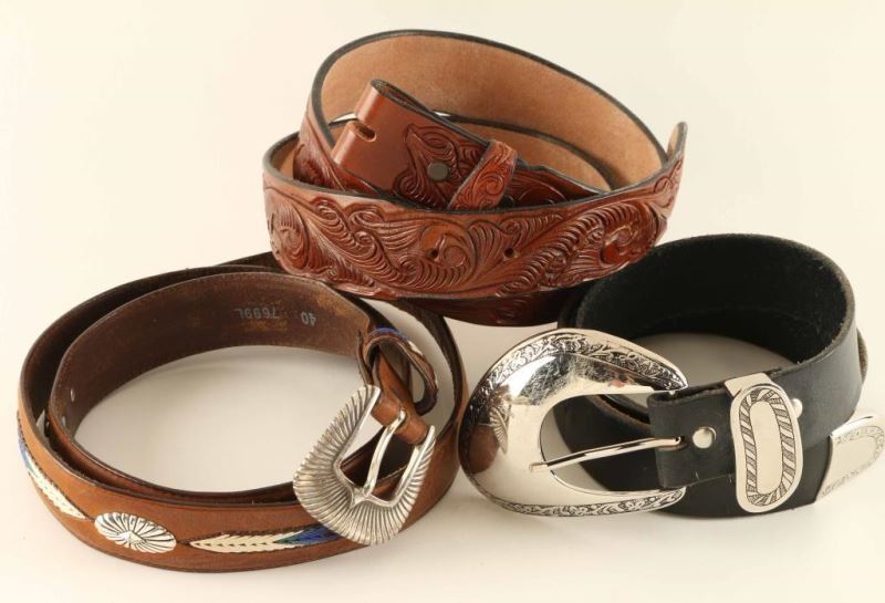 (1) Smooth black leather belt with large silver metal rounded buckle engraved with flourished edge. Includes matching keeper and belt end. Size 42 (1) Smooth brown leather belt with two silver metal conchos with stitched arrow design on belt and loop. Silver metal buckle with engraved lines, size 40. (1) Saddle tan belt stamped with flourish design, no buckle size 42.