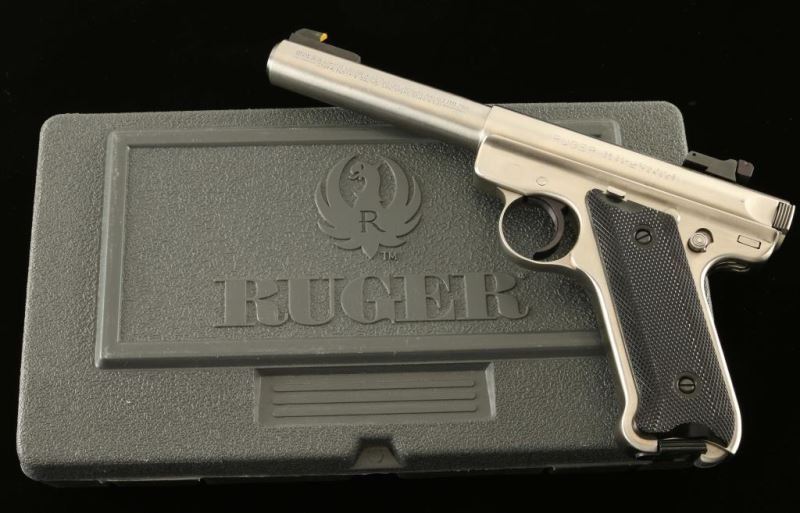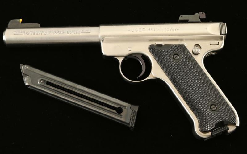 Stainless steel semi-automatic target pistol, circa 1986. Brushed finish, 5.5" bull barrel, patridge front sight, adjustable rear sight, serrated trigger, thumb safety, 10 round magazine and two-piece checkered black plastic grips with Ruger emblem on the right panel. Includes the original factory hard case with manual and spare magazine. Pistol exhibits a moderate amount of light scratches with no major wear. Action is smooth, bore is pristine and plastic grips are fine. Condition is near excellent. ***Modern Firearm***