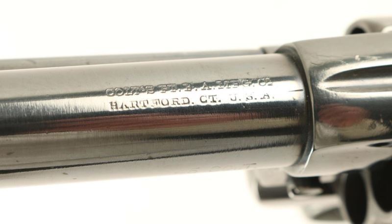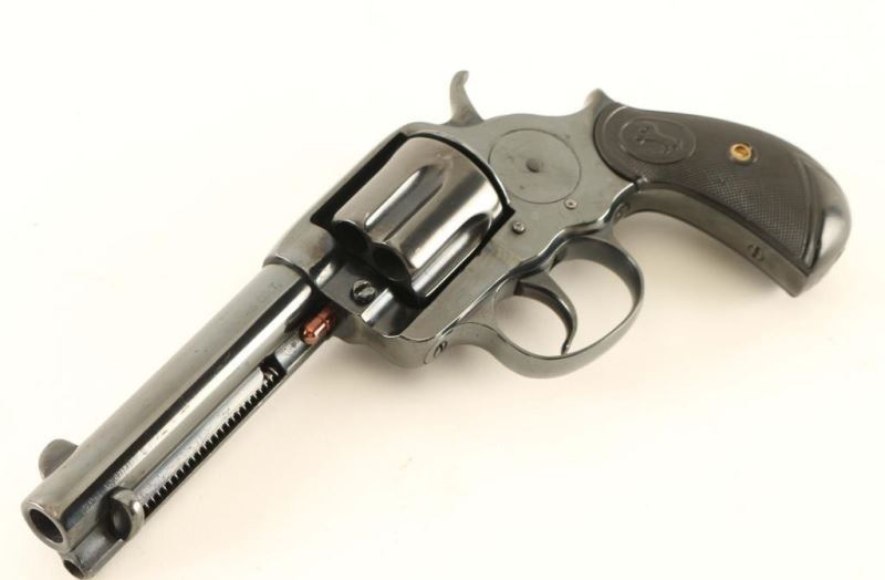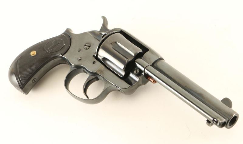 Antique large frame double action revolver, circa 1896. Features a blued refinish, 4 3/4" barrel with two line address, ejector rod, blade front sight, v-notched rear sight, fluted six-shot cylinder, smooth trigger, knurled hammer spur, no lanyard ring and two-piece checkered black plastic reproduction grips with Rampant Colt decor. Revolver exhibits approximately 95% of it's blued finish showing light wear, a couple minor losses and a small amount of scattered light surface rust. Action is sound, bore is good, barrel markings are good and hard rubber grips are near fine. Condition is good. ***Antique Firearm***