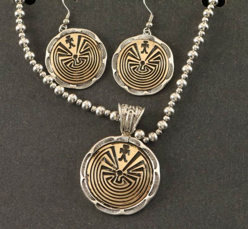 This Gold Silver Man In The Maze Pendant Set features a Hopi pattern that's been found in Native basketry as early as the 1900's. Crafted in Jeweler's Gold (Red Brass) that's been overlaid onto Silver, it's antiqued to bring forth the detail after the high shine buffing. It's 2-1/8" long, including the removable bale and it comes with a silver bead necklace; The earrings are 1-7/8" long (includes hook). by Navajo, Verna Blackgoat, it's hallmarked and stamped 'Sterling'. This Gold Silver Man In The Maze Pendant Set is gorgeous!