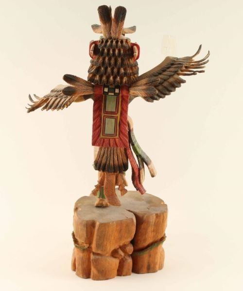 Large Eagle Kachina by Donald Howard Jr. carved of a single piece of wood and painted. Great attention to detail and texture. Signed on bottom. Measures 16 3/4"h x 12" x 5 3/4".